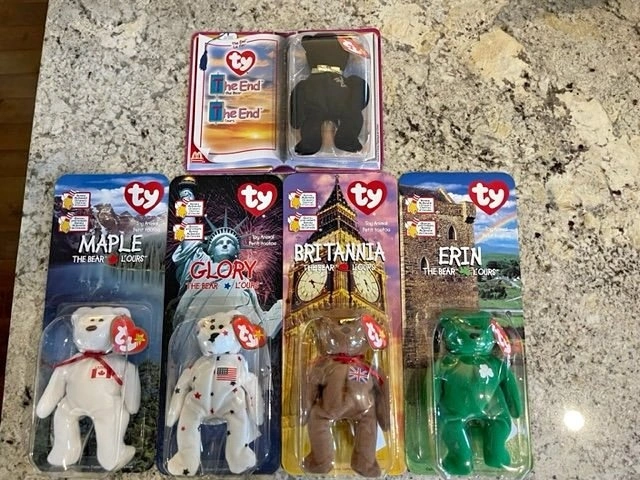 This is the full set of 1999 McDonald's International TY Babies, still in their original packaging (NIB). It also includes "The End Bear".