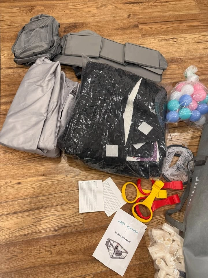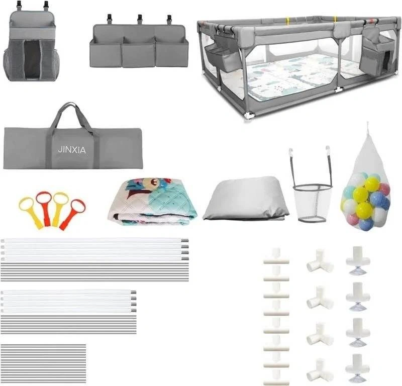 Large play area (75"x59") provides ample space for babies and can accommodate up to 3 adults and 3 infants. Includes 30 Ocean Balls, 1 Net Basket, 4 Handle Rings, and 1 King Size Folding Mat for extra entertainment. Also comes with 1 hanging accessory bag and 1 oversized organizer. The hanging bag is great for keeping necessities handy, and the storage bag makes it convenient for outdoor use. The fabric is thicker to prevent tearing, and the stainless steel casing edges are smooth to avoid scratches. The folding mat has a soft, breathable polyethylene fiber lining for comfort. Zippers are made of high-strength composite material for durability. Features 4 non-slip suction cups on the bottom for stability on smooth floors, preventing sliding and tipping. Visible ventilation nets on all sides allow for easy observation of the baby. The mat quickly absorbs liquid spills. The playpen fabric, storage bag, and mat are machine or hand washable and won't shrink or fade.