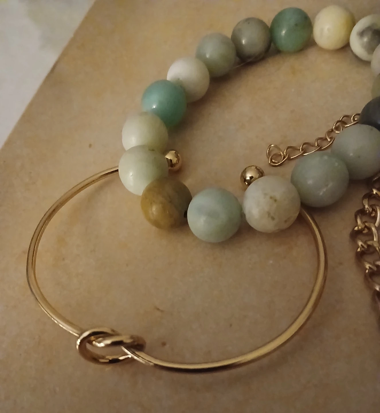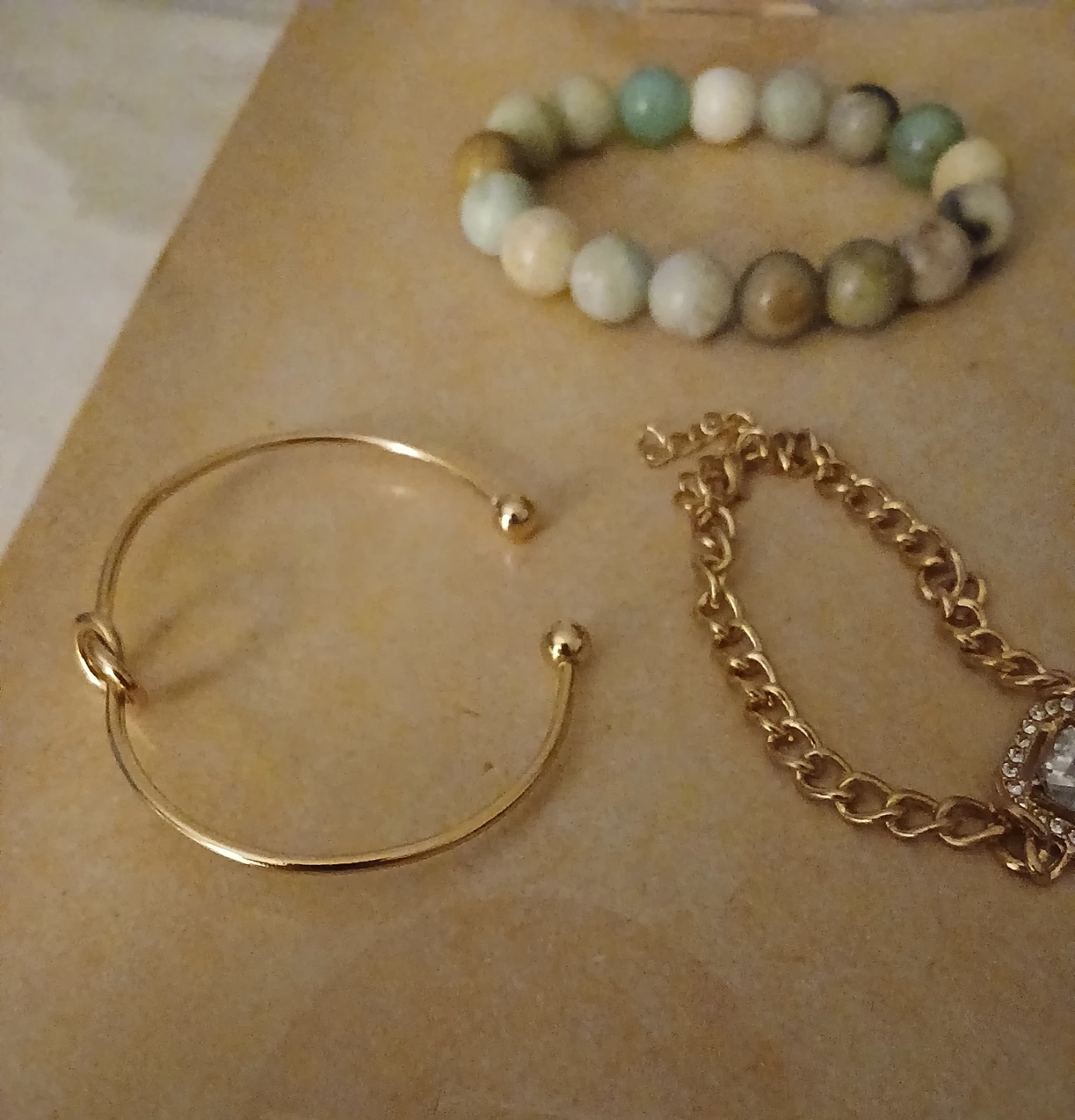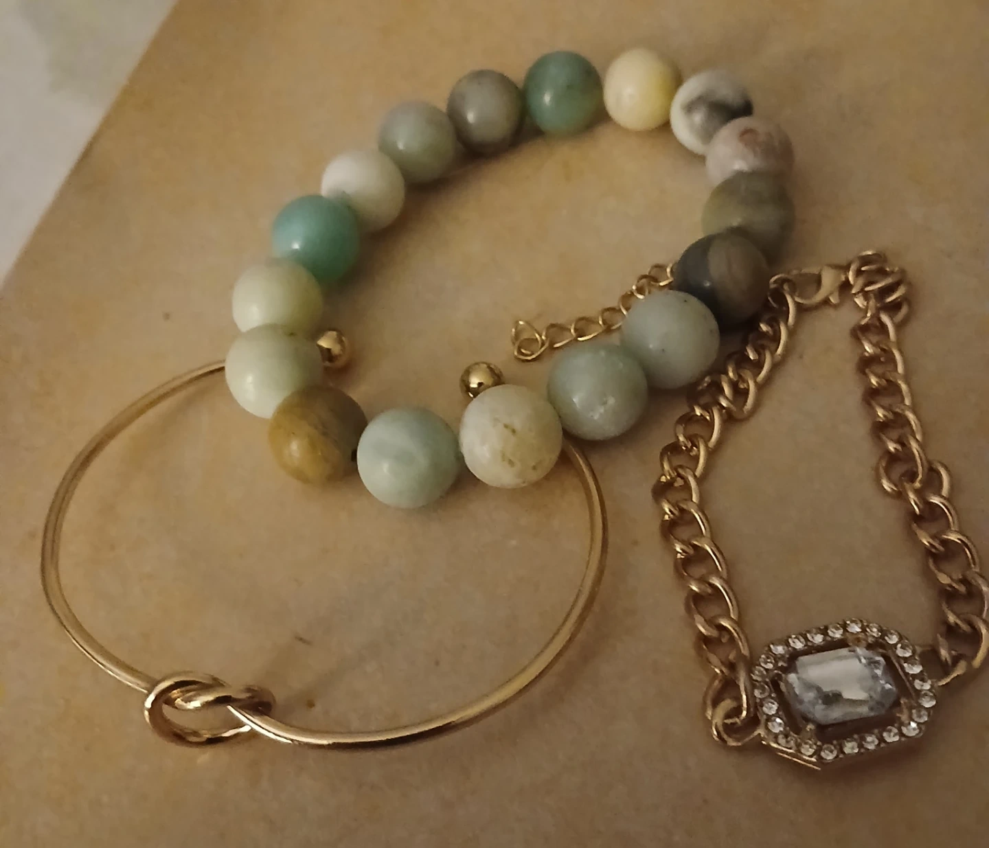 Includes a beaded stretch bracelet with natural stones, a gold-tone bangle with a knot detail, and a gold-tone chain bracelet with a rhinestone accent. These accessories add a lovely touch to any outfit.
