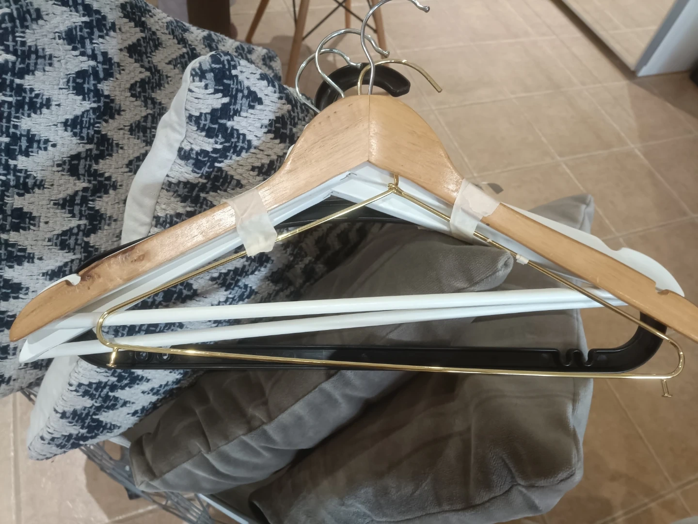 Four decorative cushions with different textures and patterns, perfect for refreshing your home decor. Includes a combination of wooden, plastic, and metal hangers to organize your closet. Price is negotiable.
