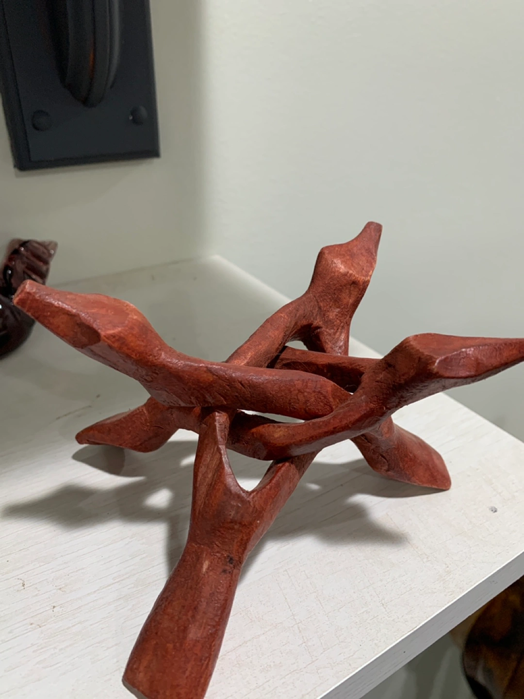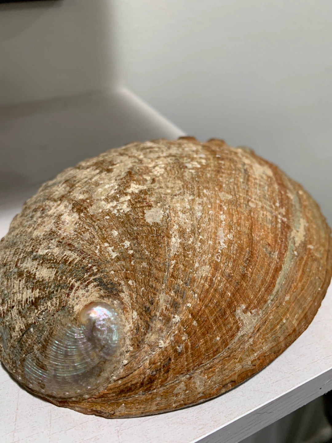 Beautiful abalone shell with a wooden stand! This unique piece would look great as decor in any room. The shell has a stunning iridescent interior. It is in great condition and ready for a new home