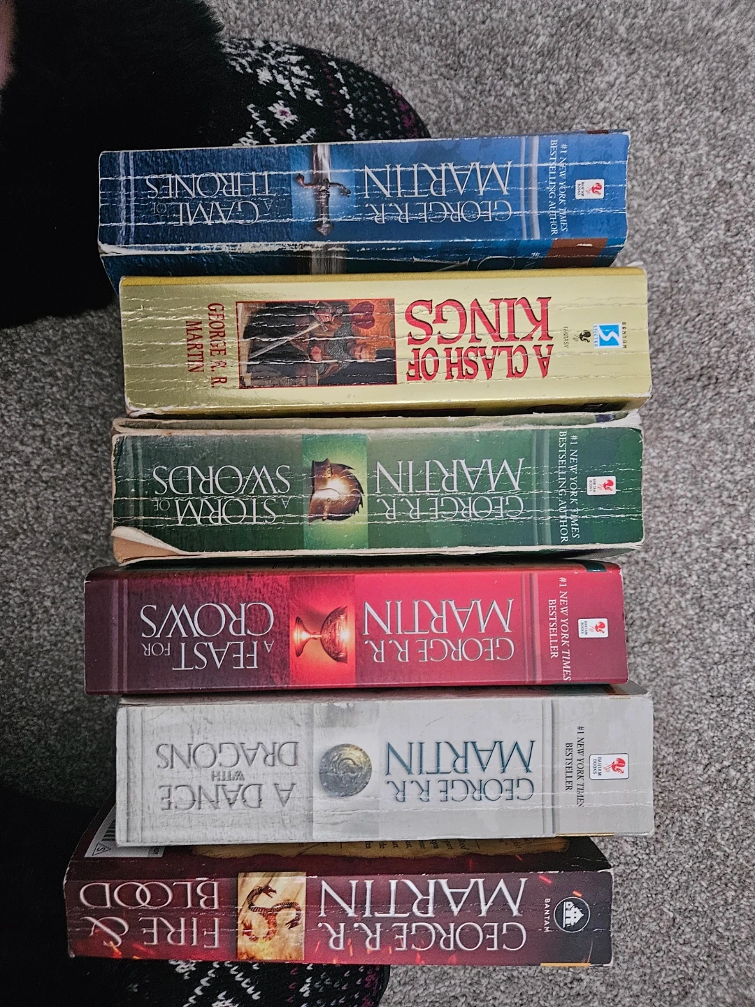 Collection of George R.R. Martin books from the A Song of Ice and Fire series. Includes "Fire & Blood", "A Dance With Dragons", "A Feast For Crows", "A Storm of Swords", "A Clash Of Kings", and "A Game of Thrones". Pick up by WEM