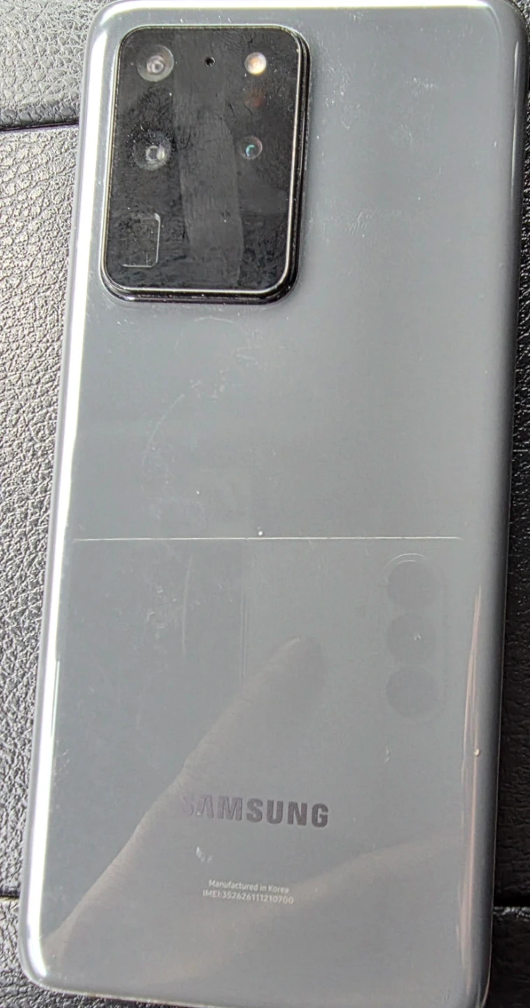 Samsung Galaxy S20 ultra smartphone. Manufactured in Korea. Features a triple camera system.