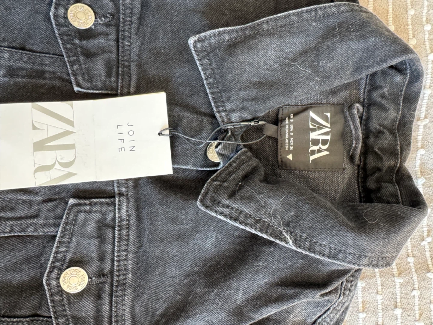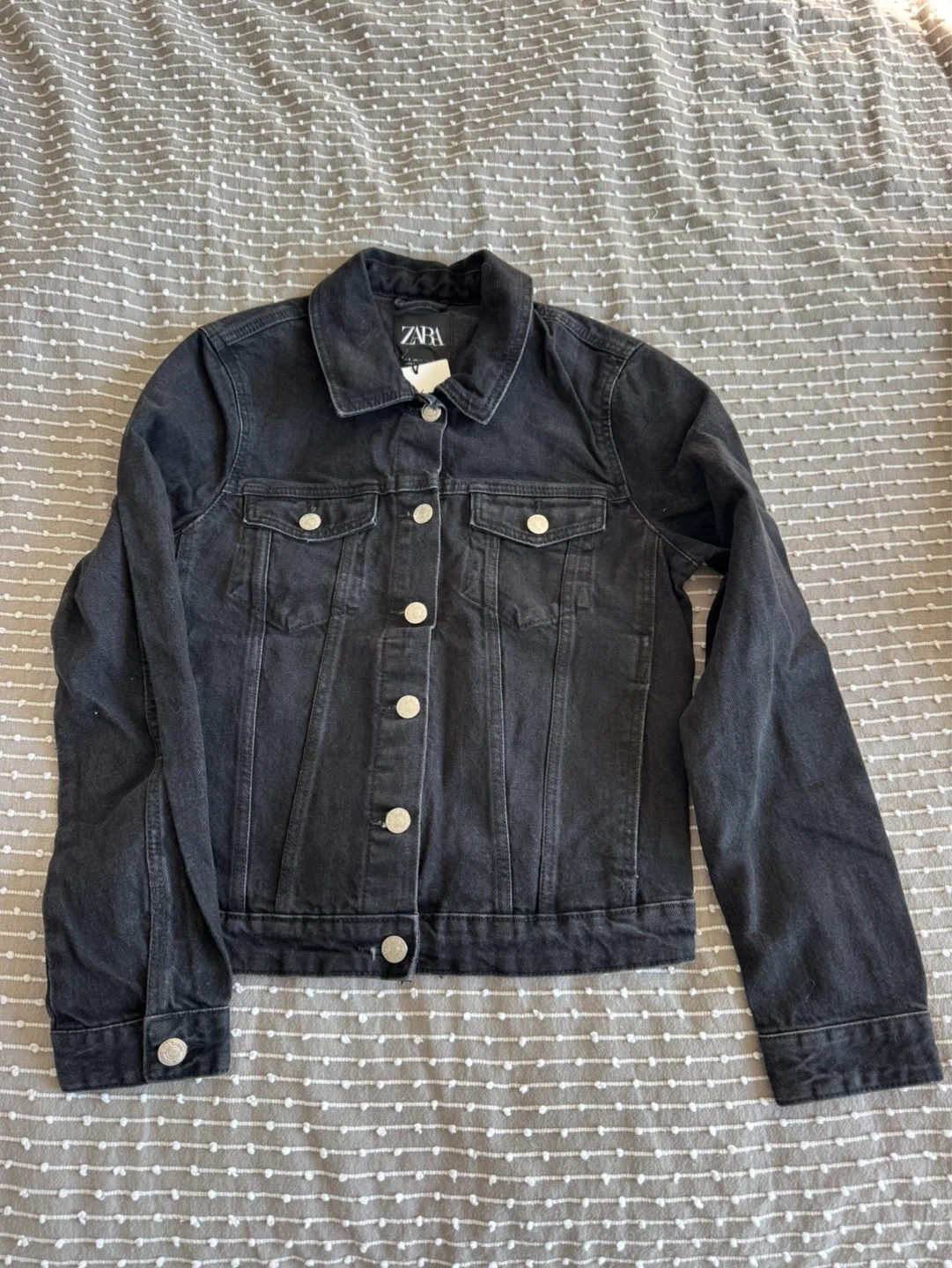 ZARA black denim jacket. Includes original tags. Size S , close fit. Made with at least 95% ecologically grown cotton. Button closure and cuffs. 4 pockets. New. Never worn. Bought for a project but didn’t use. This is a close fitted fit.