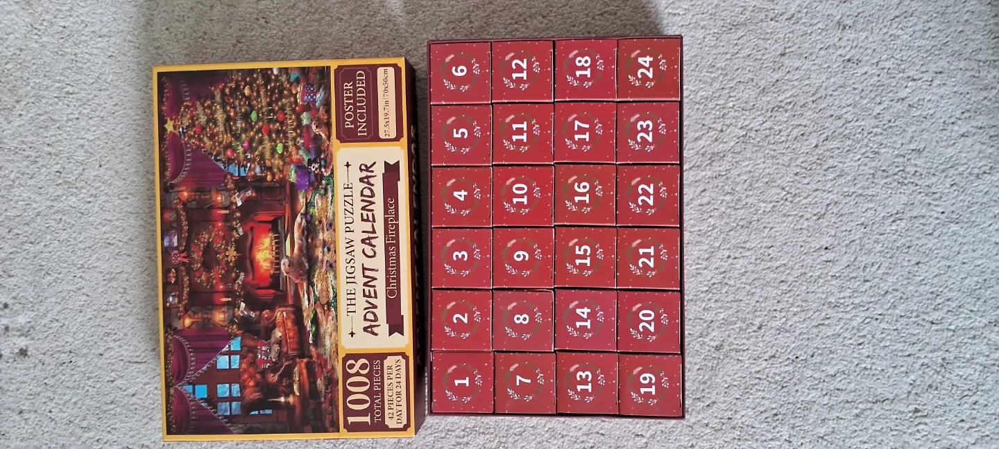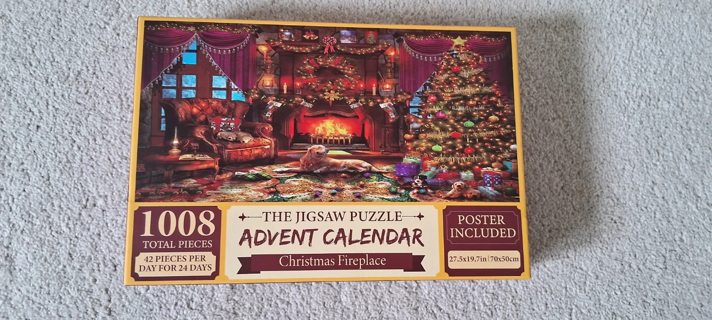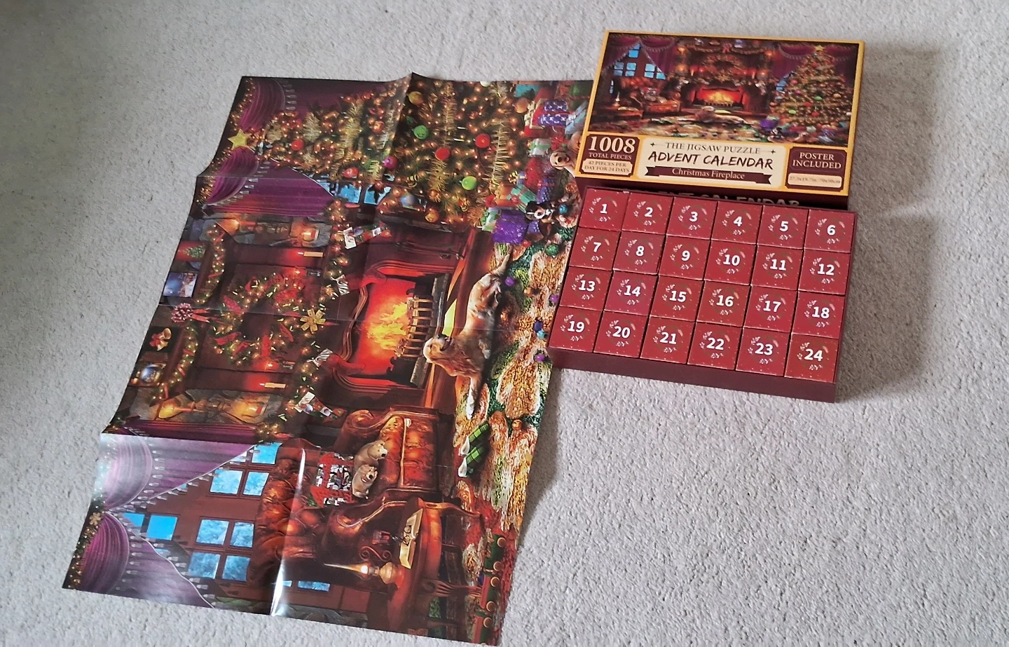 This 1008-piece jigsaw puzzle advent calendar features a festive Christmas fireplace scene. A poster is included for guidance.