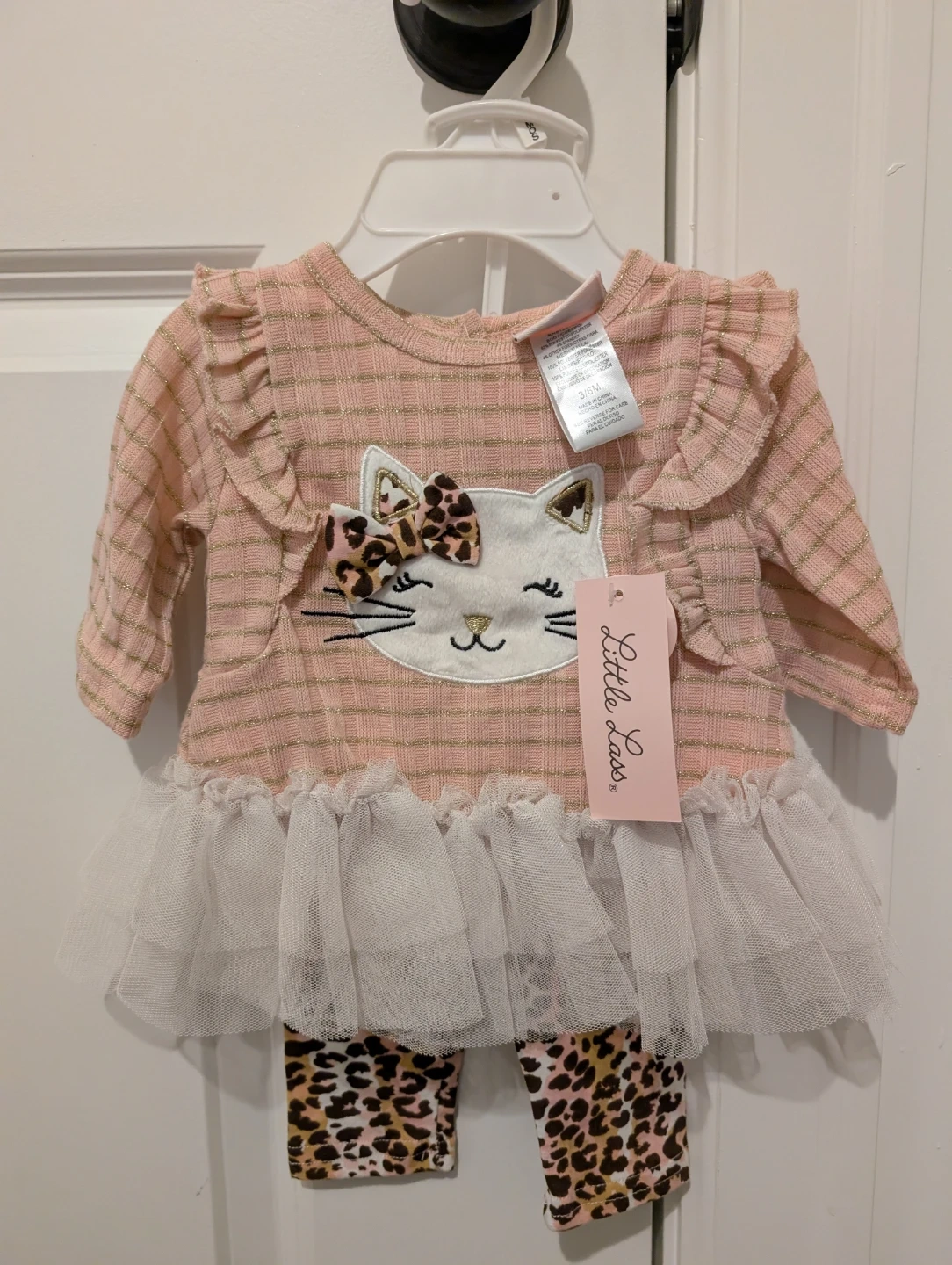 Adorably cute pink and gold striped tunic with a sweet cat face design and a tiered white tutu. Matching leopard print leggings complete this charming outfit. Made from a polyester blend for comfort. Perfect for your little one's wardrobe!