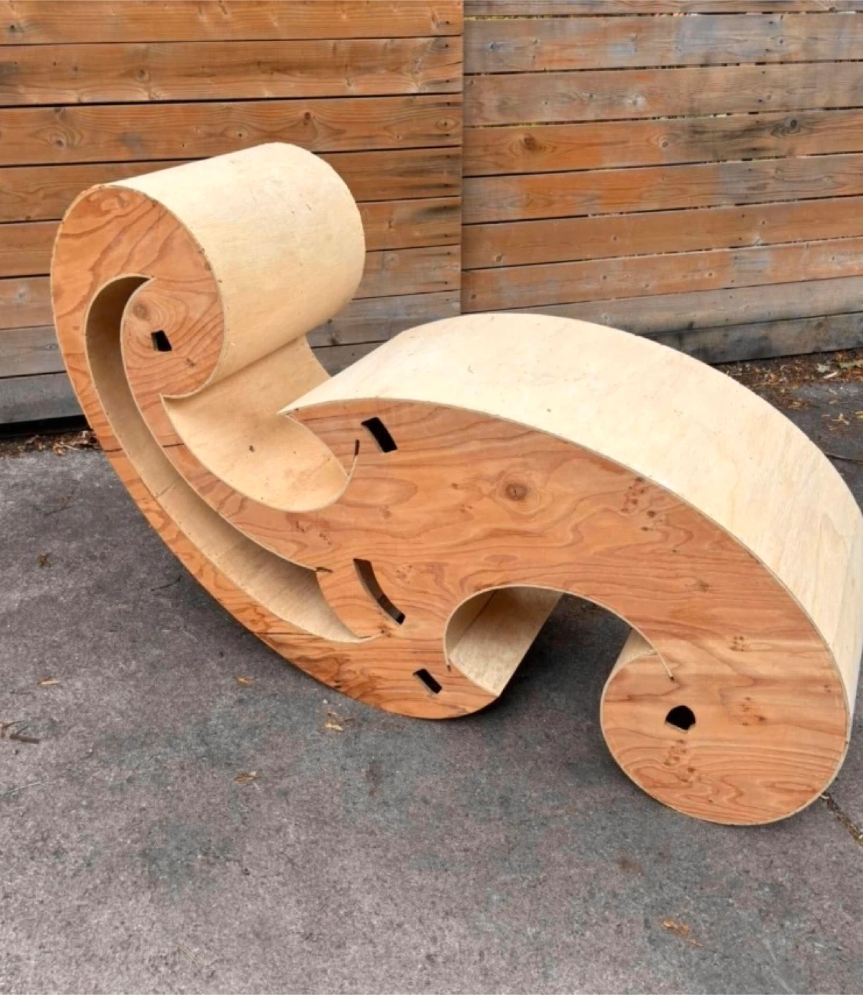 This is a one-of-a-kind sculptural piece made from plywood, fir and balsam. It's a conversation starter and a functional seating option. The layered plywood construction gives it a dynamic, flowing form. It rocks and has a hollow interior if you want to add lights.