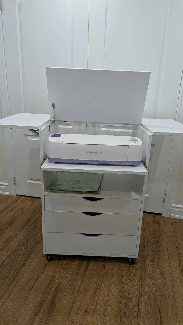 This Cricut mobile workstation is perfect for crafters needing organized storage. While it has been used, it remains in good condition and offers a convenient workspace with ample storage.