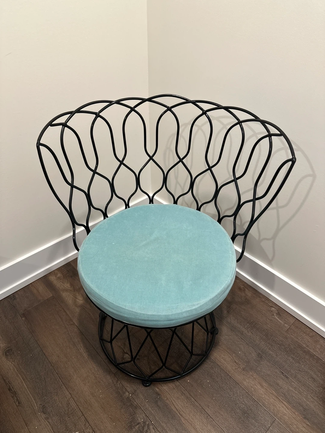 Black metal chair with light blue cushion