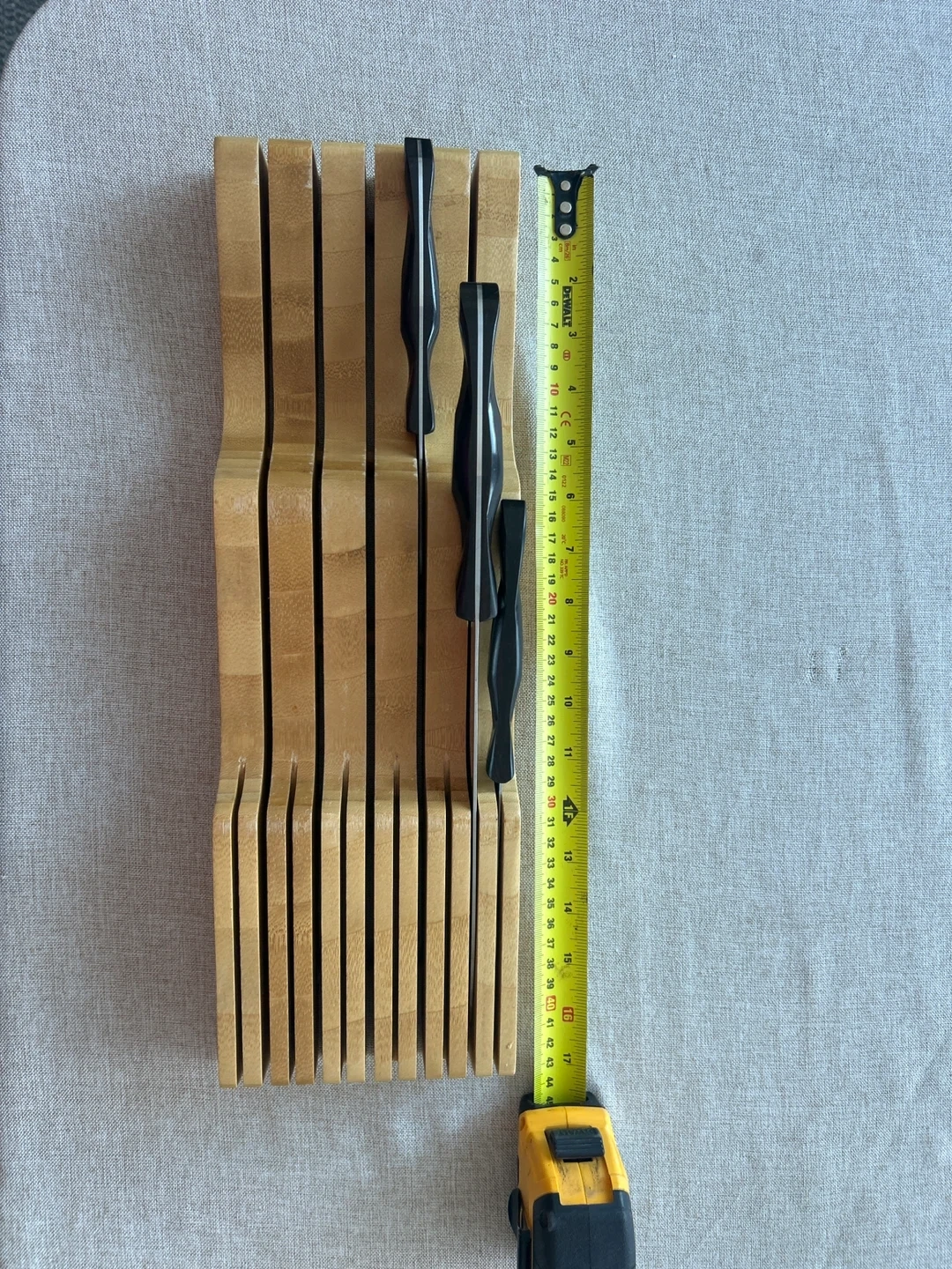 This kitchen drawer knife block is made from durable bamboo. It has multiple slots to safely store your knives. Keep your cutlery organized and accessible!