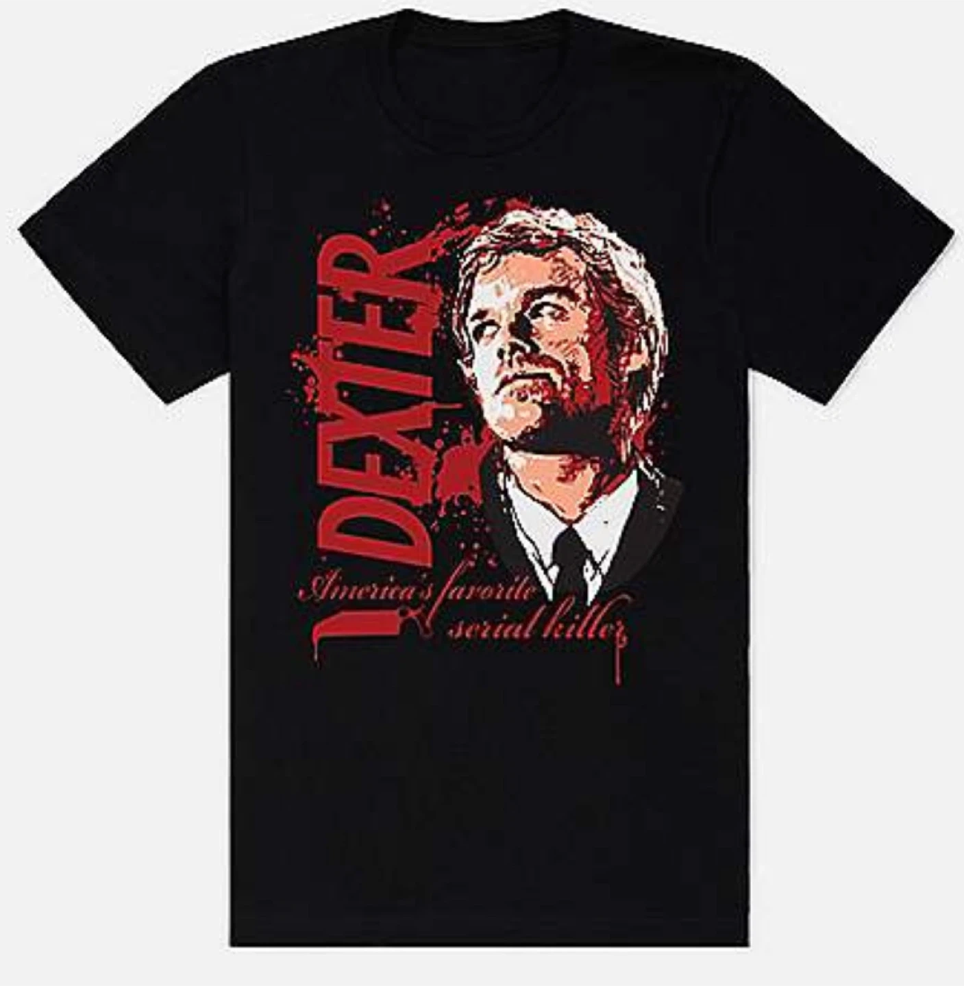 Black t-shirt featuring Dexter Morgan's portrait and the show's iconic "America's favorite serial killer" tagline. Made from comfortable, breathable fabric. A great piece for fans of the show!