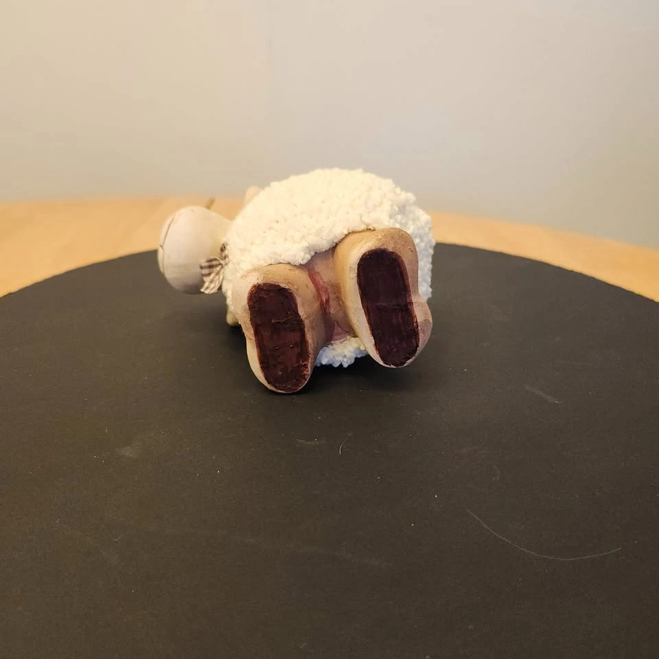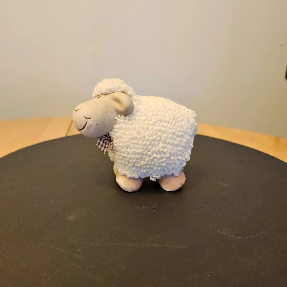 He's made out of ceramic and has a soft textured loop material over his body for the wool.