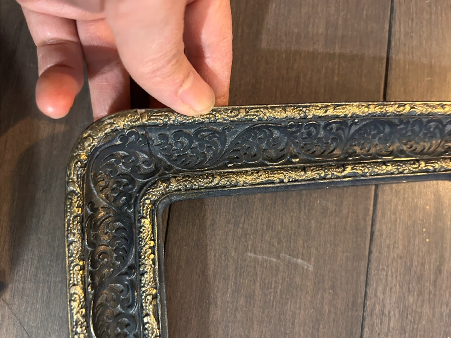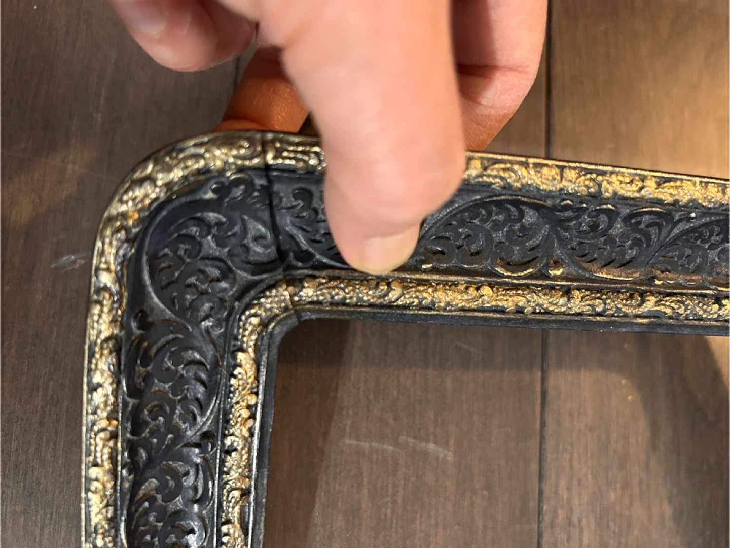 Selling a decorative picture frame with a black and gold finish. It has an ornate design around the edges. Has invisible crack. Perfect for displaying your favourite memories!