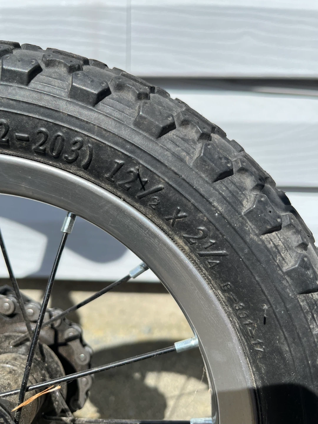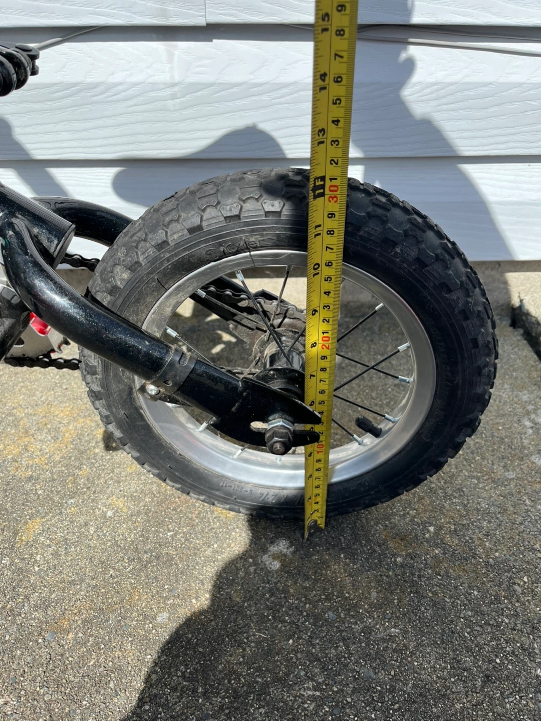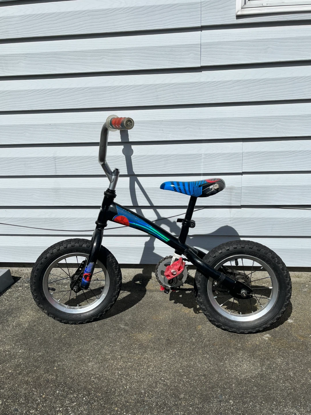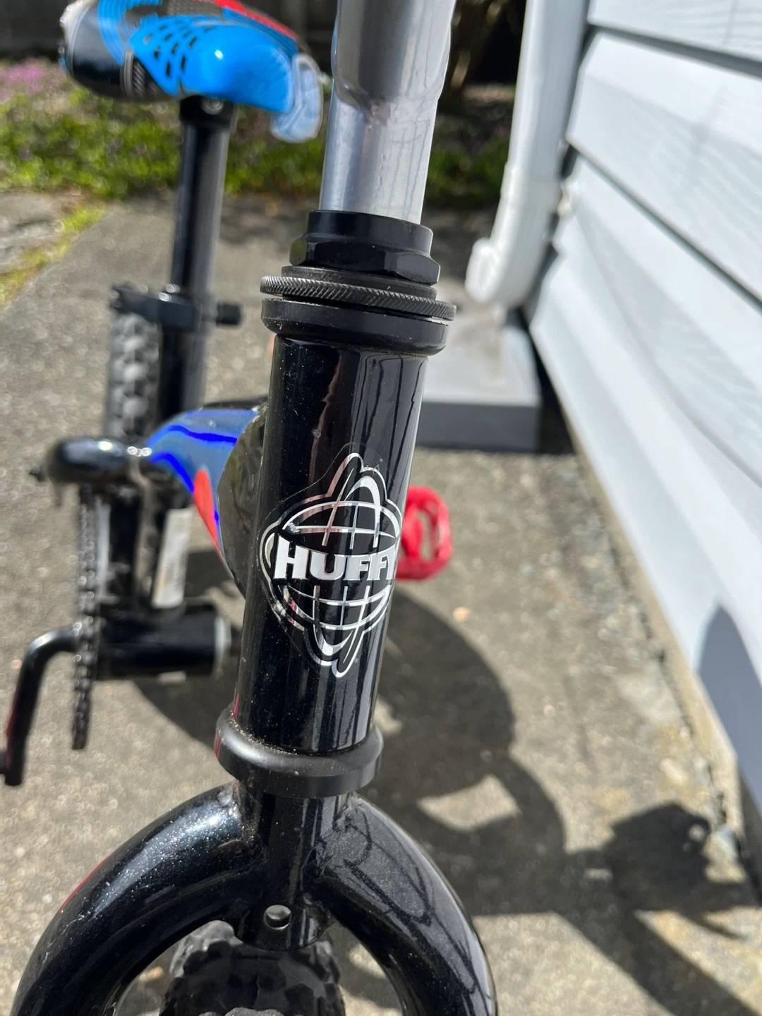 Huff brand kids' bicycle with a black frame and blue and red seat. It's a small size, suitable for young riders. Red pedals add a pop of colour. Great for learning to ride!