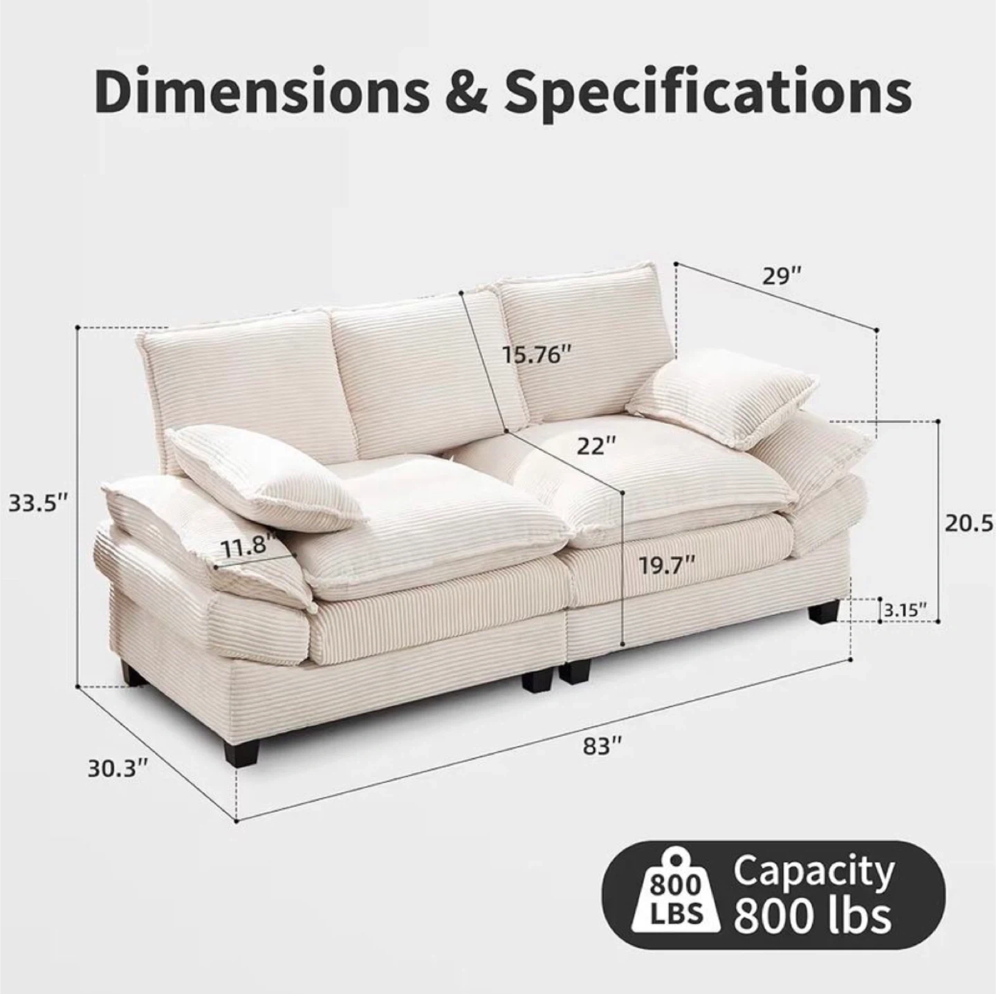 Comfortable cream corduroy sofa with plush cushions. Measures 83" wide, 30.3" deep, and 33.5" high. Seat depth is 22". Supports up to 800 lbs.
