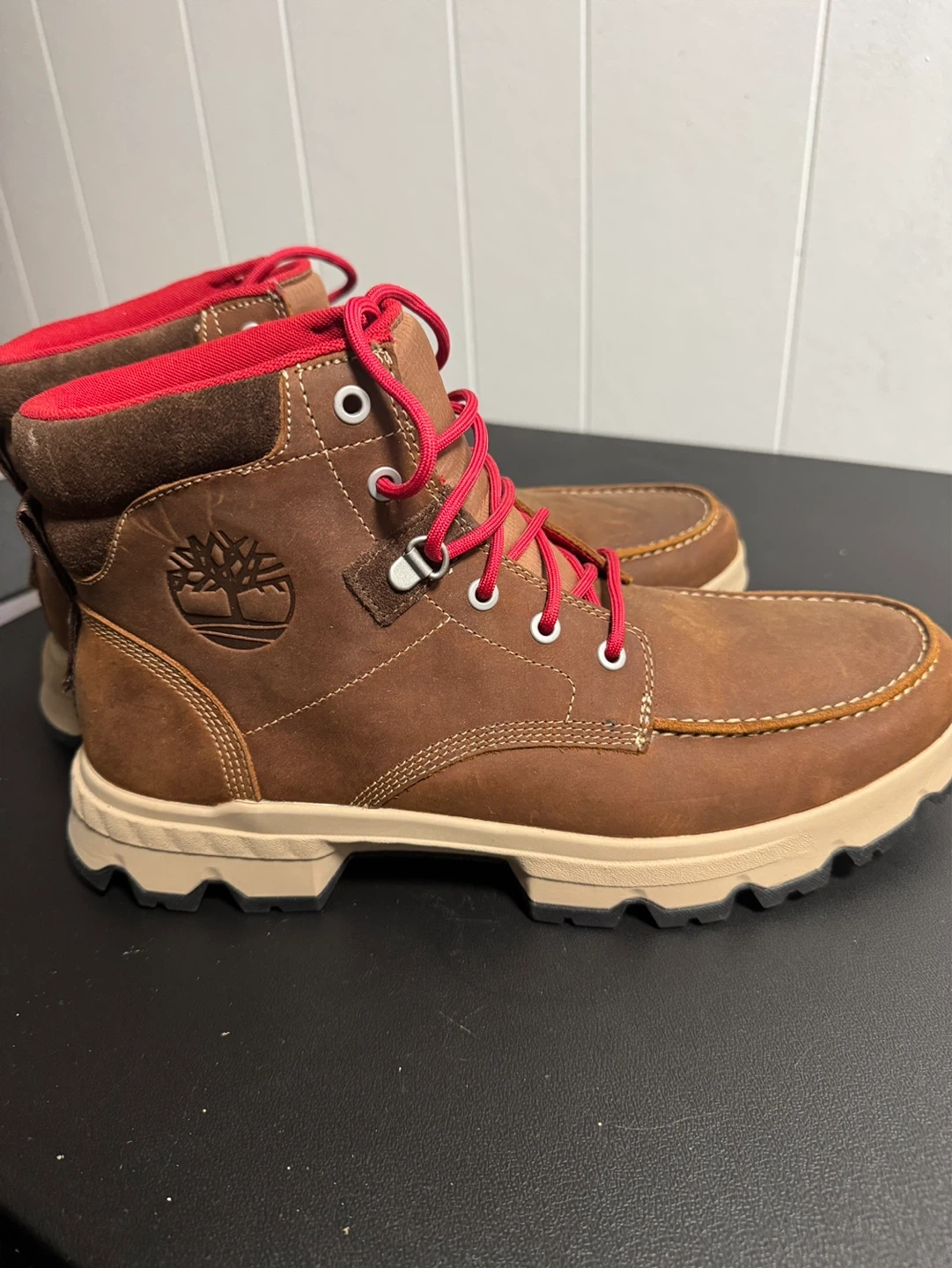 Timberland boots with a durable brown leather exterior. They feature contrasting red laces and lining for a pop of colour. The rugged rubber sole provides excellent traction for various terrains.