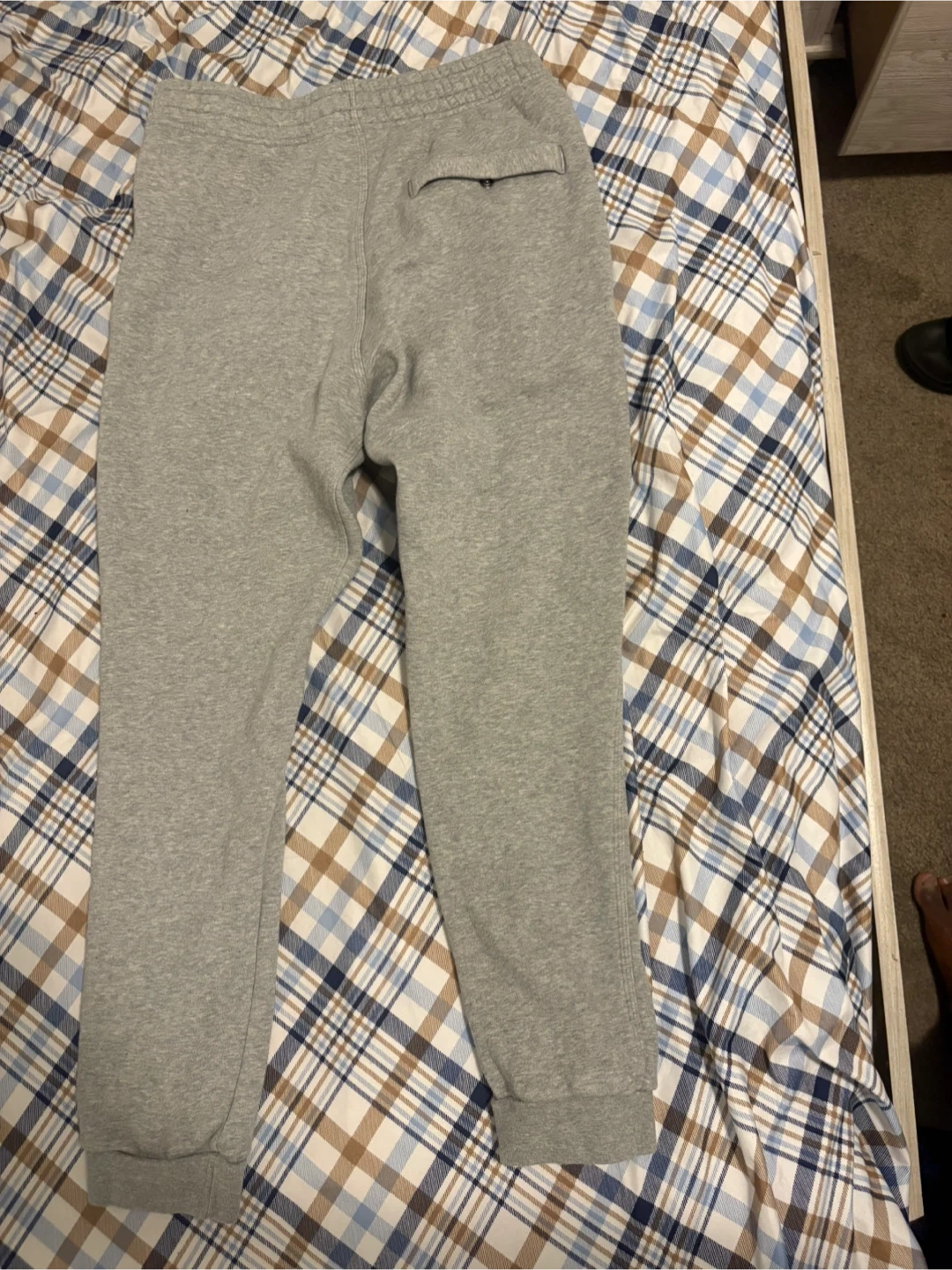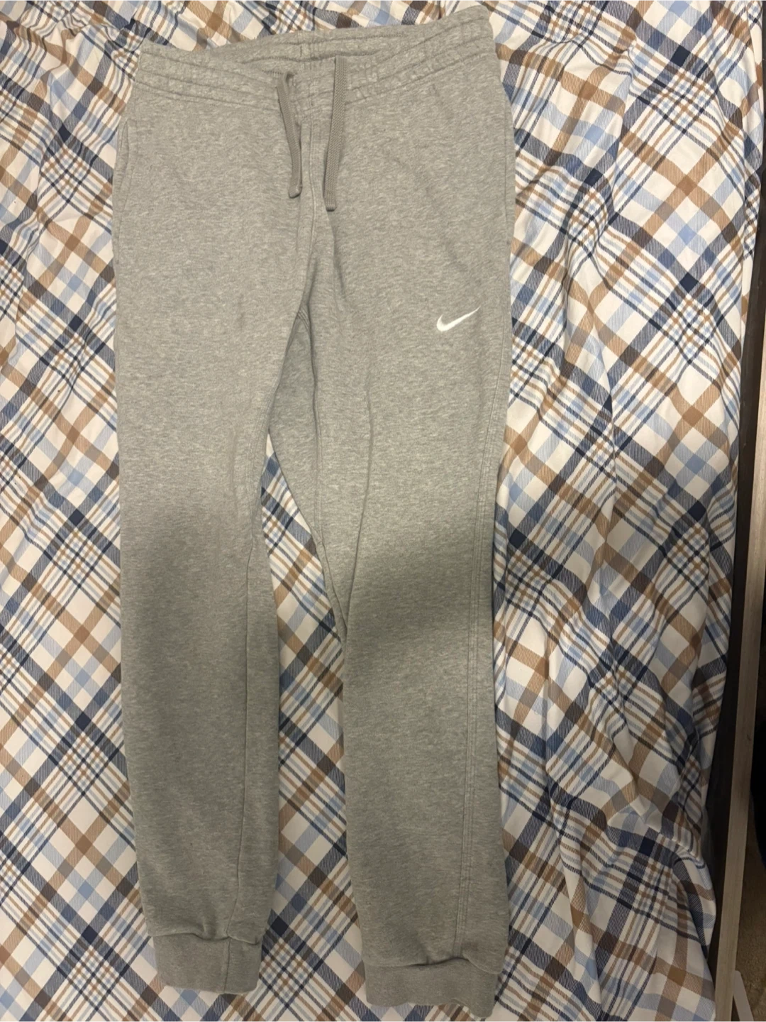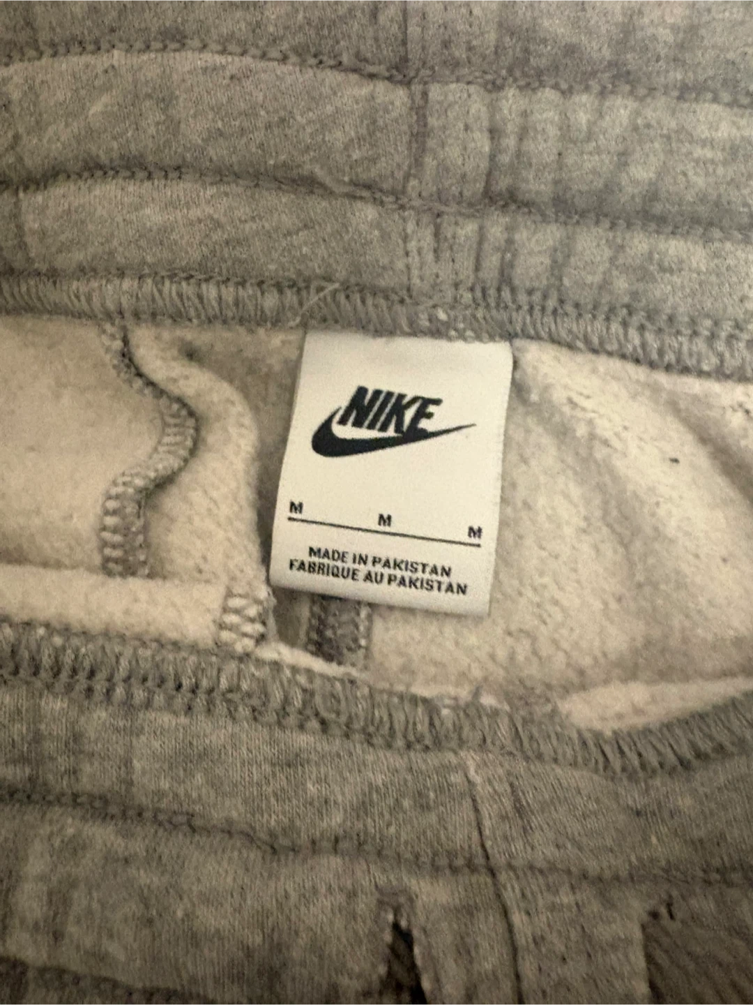 These are a pair of grey Nike sweatpants in a size medium, perfect for workouts or lounging around. As you can see, they've been enjoyed and are in good condition. These sweatpants feature a comfortable elastic waistband with a drawstring, along with the classic Nike swoosh on the left leg.
