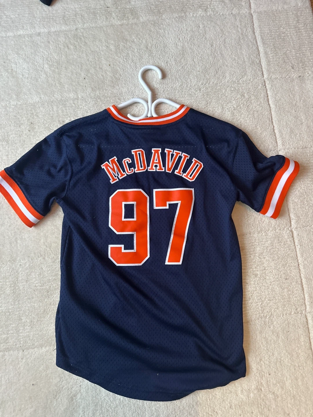 This is a youth size medium Edmonton Oilers jersey featuring McDavid's name and number 97. It's made of a breathable mesh material with contrasting orange and white trim. A great piece for any young Oilers fan!