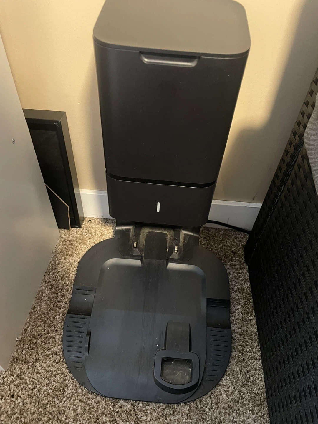 This is an iRobot Roomba Clean Base Automatic Dirt Disposal for select Roomba models. It automatically empties the robot's bin into the base. It's black and grey.