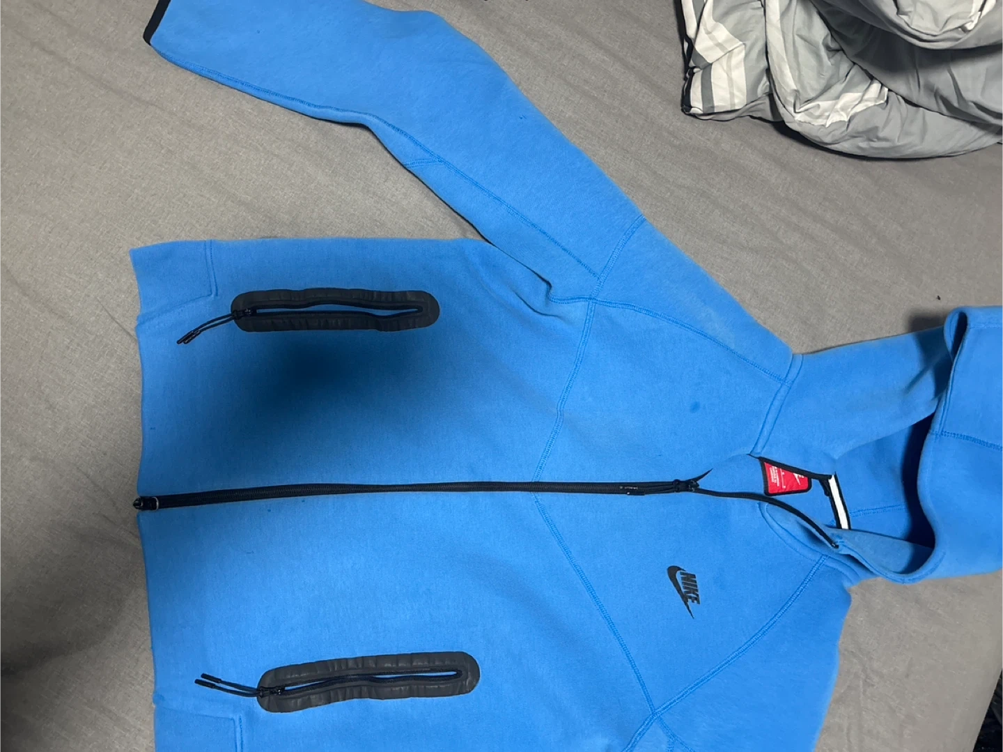 This is a blue Nike Tech Fleece zip-up hoodie. It's made from a soft, warm fabric. Features include a full zip closure and pockets.