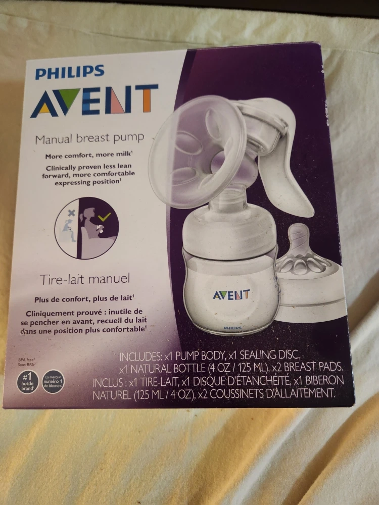I'm selling a brand new Philips Avent manual breast pump. It comes with the original box and includes the pump body, sealing disc, a 4 oz/125 ml natural bottle, and two breast pads. This pump is designed for more comfort and less leaning forward, making expressing milk more comfortable!