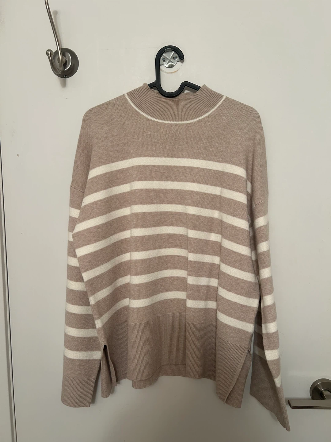 Cozy striped mock neck sweater from Cynthia Rowley. Features a relaxed fit with side slits. Made from a soft knit material.