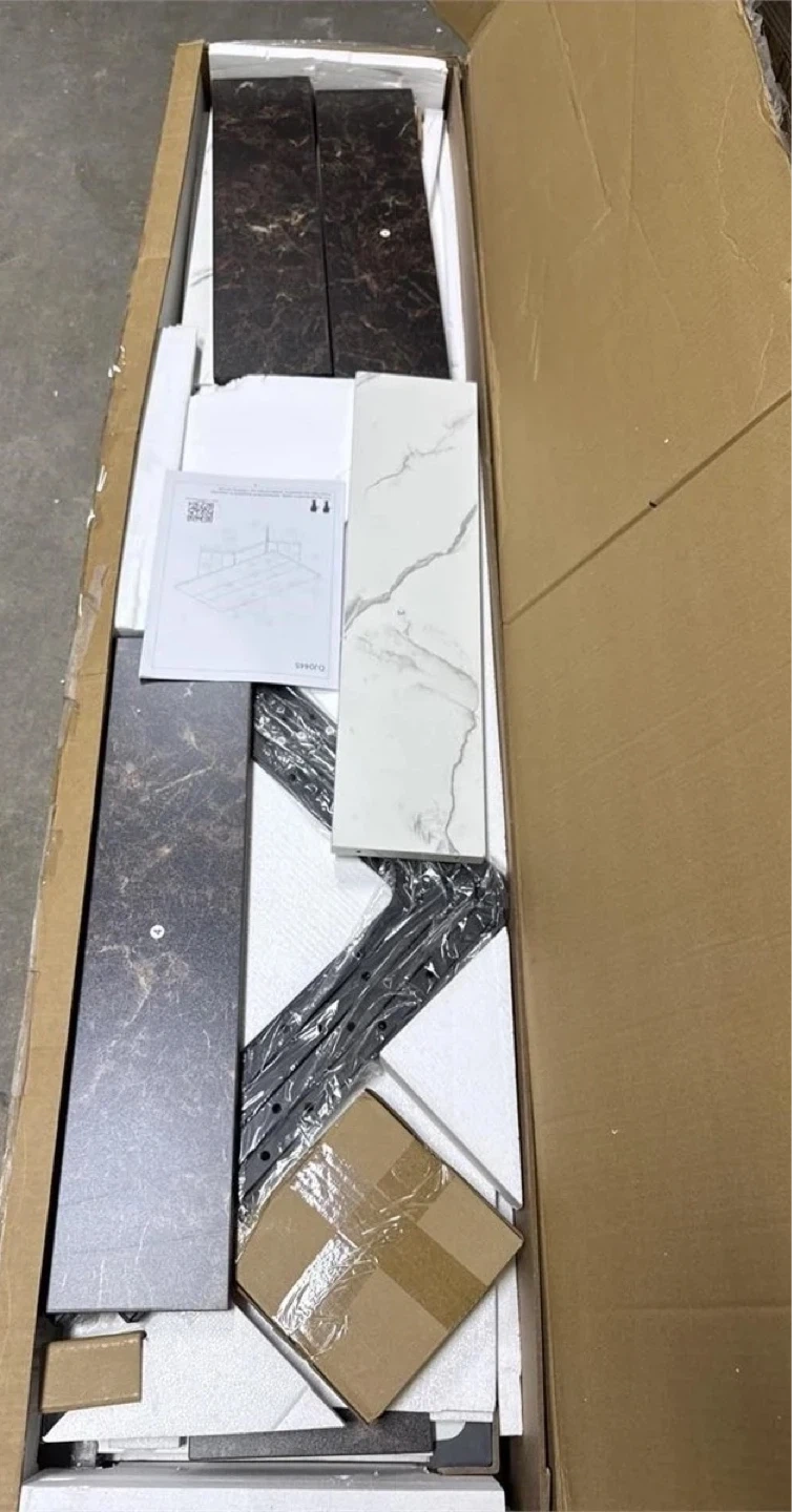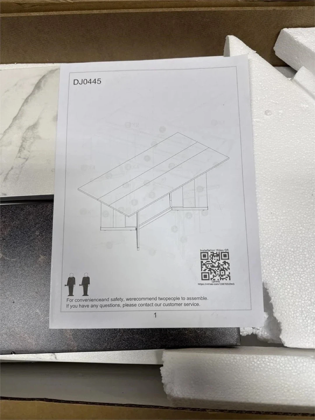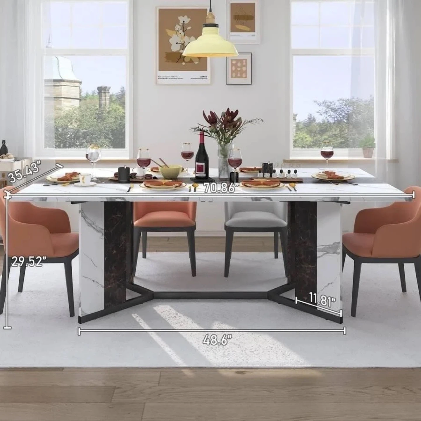 This dining table features a white marble effect top with a dark, patterned inlay. Its base is a sleek metal frame with dark brown accents. Dimensions are 70.86" L x 35.43" W x 29.52" H. Assembly is required, with instructions included.
