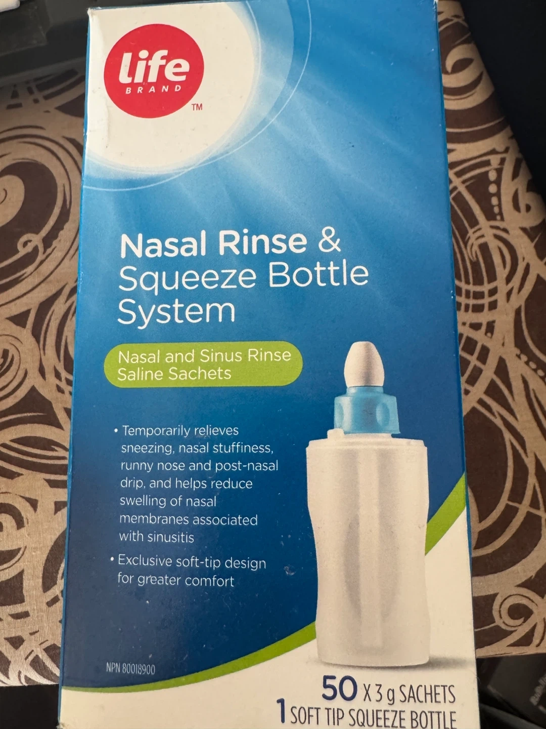 This Life Brand nasal rinse system comes with a soft-tip squeeze bottle. It includes 50 saline sachets for nasal and sinus rinsing. Temporarily relieves sneezing, nasal stuffiness, and runny nose.