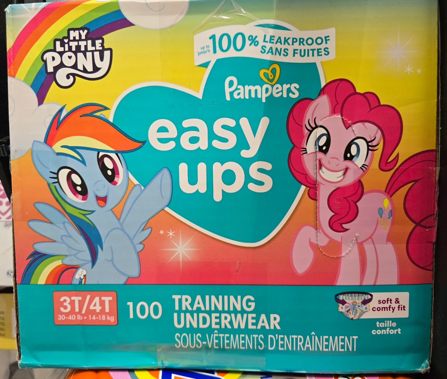 100 count package of size 3T/4T training underwear. Leakproof design. Features My Little Pony characters. Soft and comfy fit.