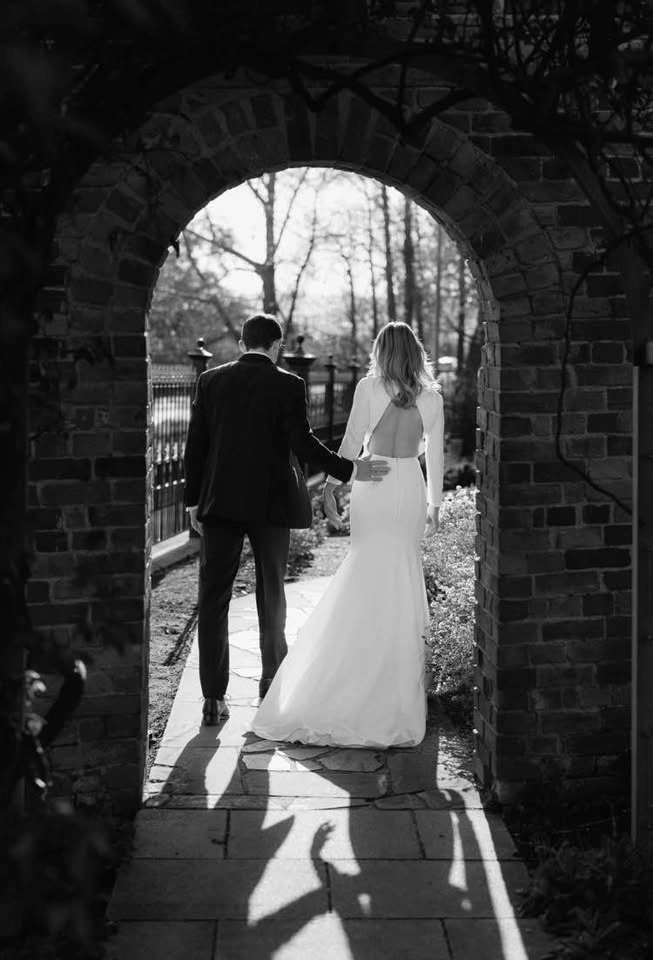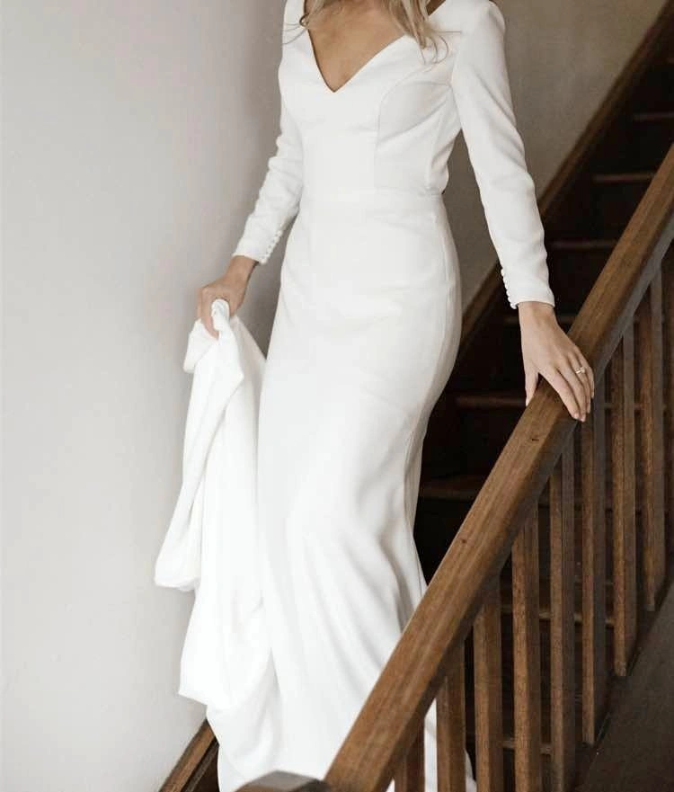 Mikaella Bridal dress style 2235 by Paloma Blanca, $2300 retail. Colour: Natural (closer to white than ivory). Crêpe Wedding Dress with V-neckline and long sleeves, fabric covered buttons on sleeve hem. Inverted V-back neckline with fabric covered button closure at neck. Optional beaded belt at waist. Fit and flare skirt with inverted seam at back of train. Perfect for a fall or winter wedding. Sleeves have been altered to 3/4 length but can be let back out if desired with all original buttons. Sleeve circumference near hem is 18cm (non-stretch fabric). A few tiny pulls on sleeves, but otherwise free of stains or damage. Recently dry cleaned and steamed. Approximately street size 4/6: Chest 90cm, Waist 75cm, Hips 97cm. Front hemmed for 5’9”.