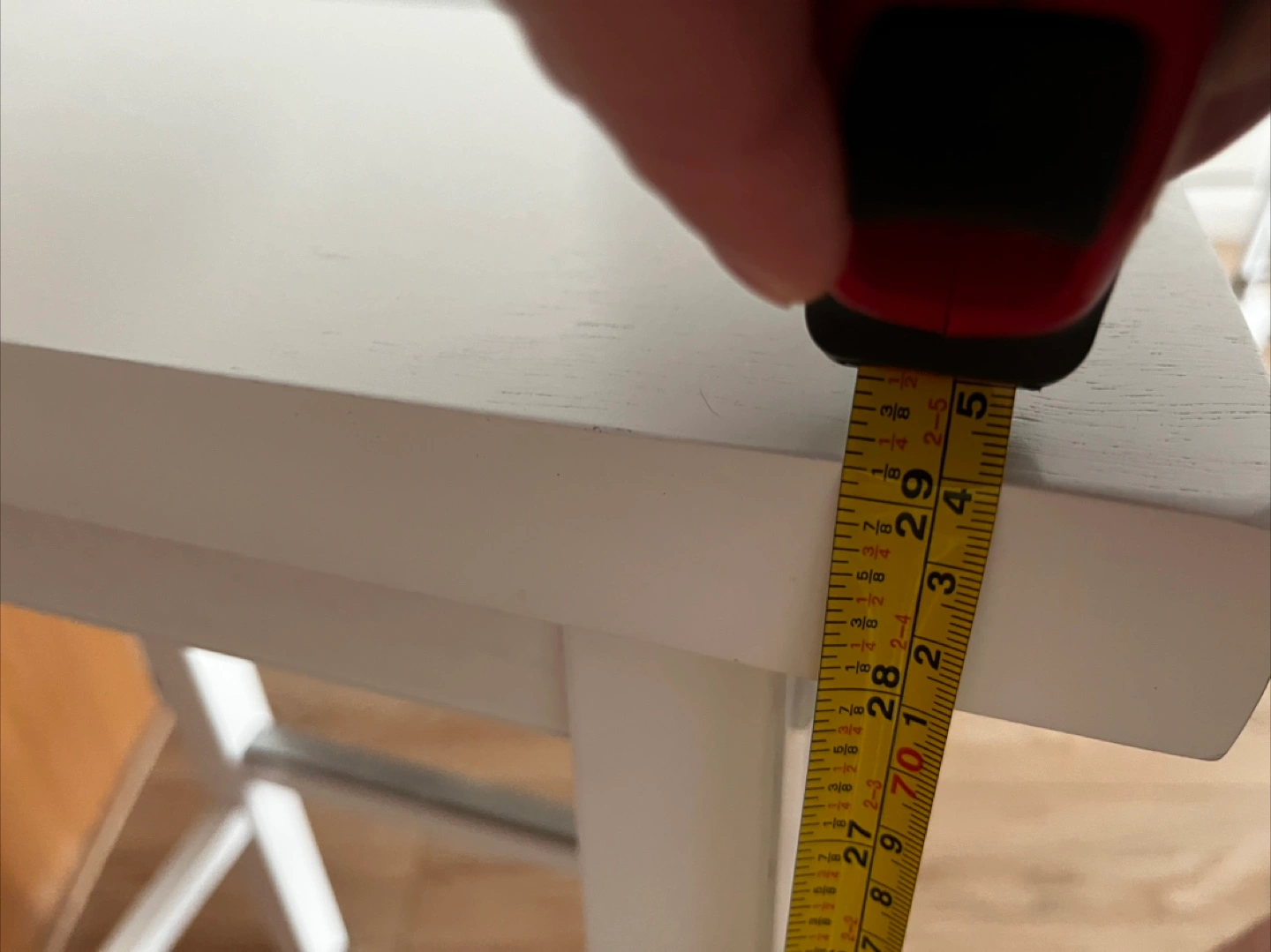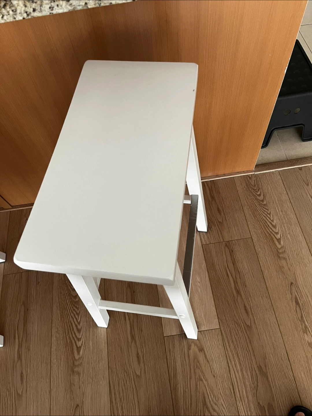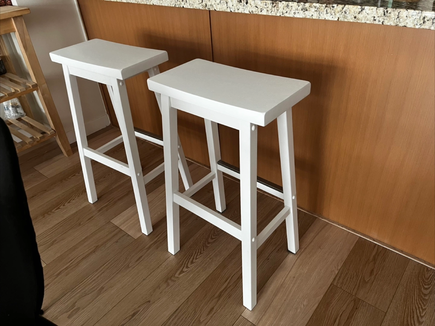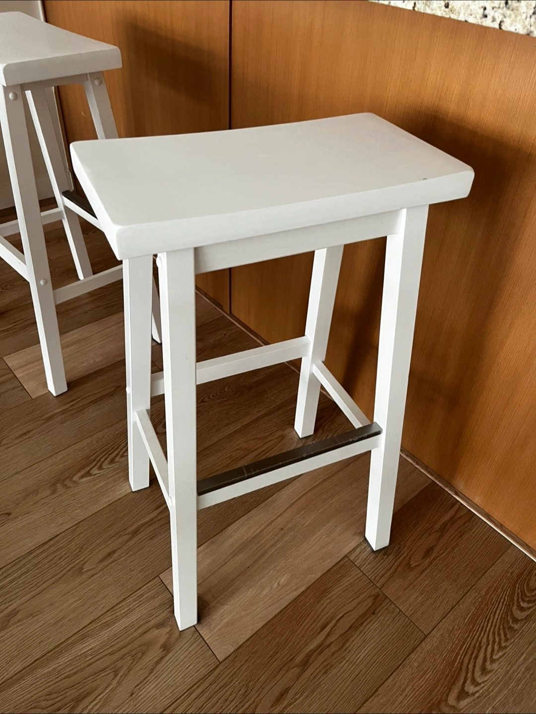 A set of two white stools. Solid wood construction. Features a metal footrest. Excellent stools to make any kitchen more welcoming.