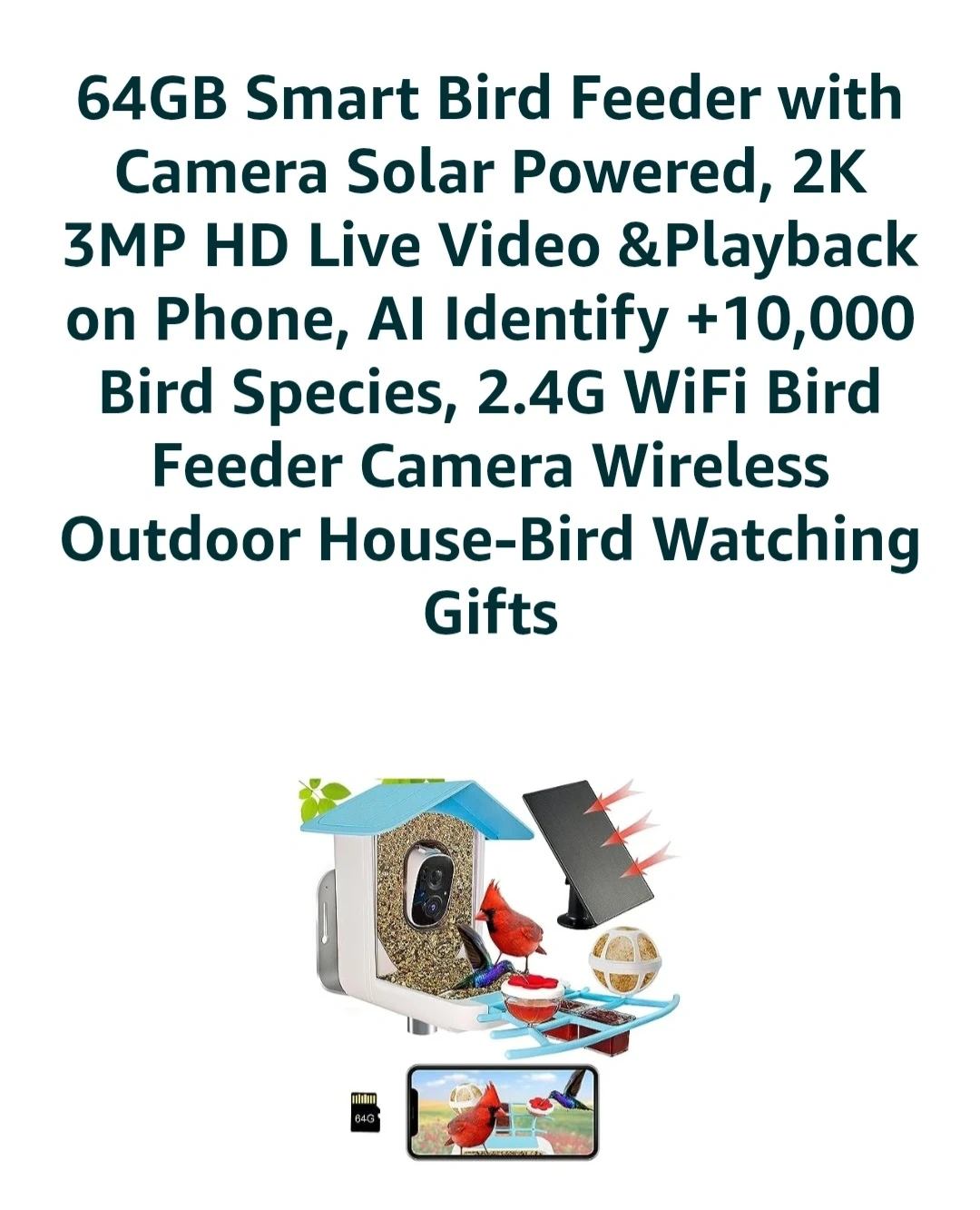 This smart bird feeder has a 2K 3MP HD camera and is solar-powered. It connects via 2.4G WiFi to your phone for live video and playback. It also features AI to identify over 10,000 bird species. It comes with a 64GB card.