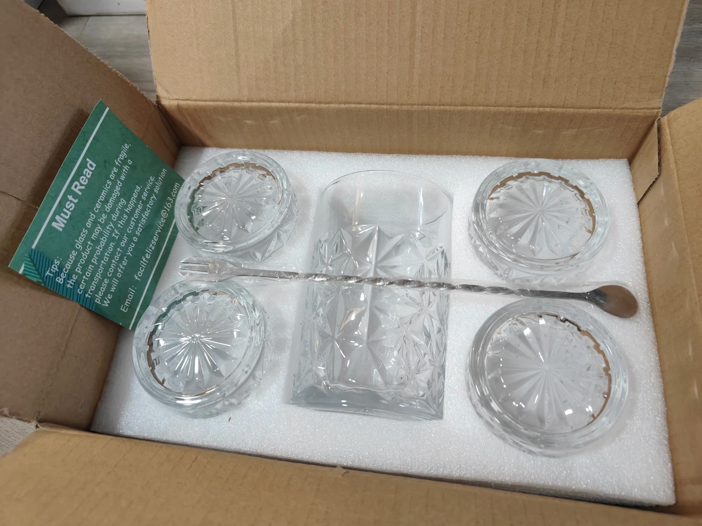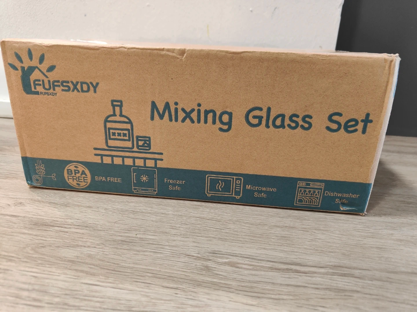 16Selling a brand new FUFSXDY mixing glass set! It comes with a mixing glass, four coasters, and a stirring spoon. The box indicates that the set is freezer, microwave, and dishwasher safe. Great for making cocktails or mocktails at home!
