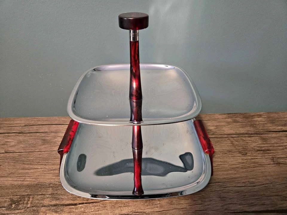 Charming two tier serving tray. Shiny silver-colored square trays. Red marbled BAKELITE handles and center support. Great for snacks, desserts, or just displaying things. Pick up Upper Kenilworth and Mohawk area on the East Hamilton mountain.