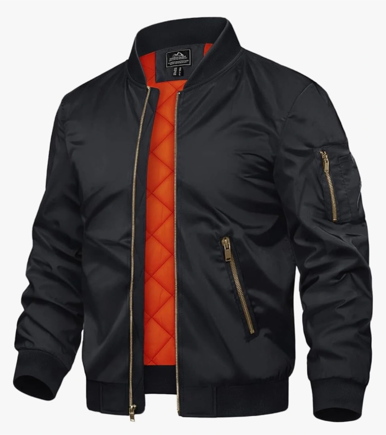 This is a black bomber jacket with an orange quilted lining. It features gold zippers on the pockets and a ribbed collar, cuffs, and hem. Made for warmth and style!
