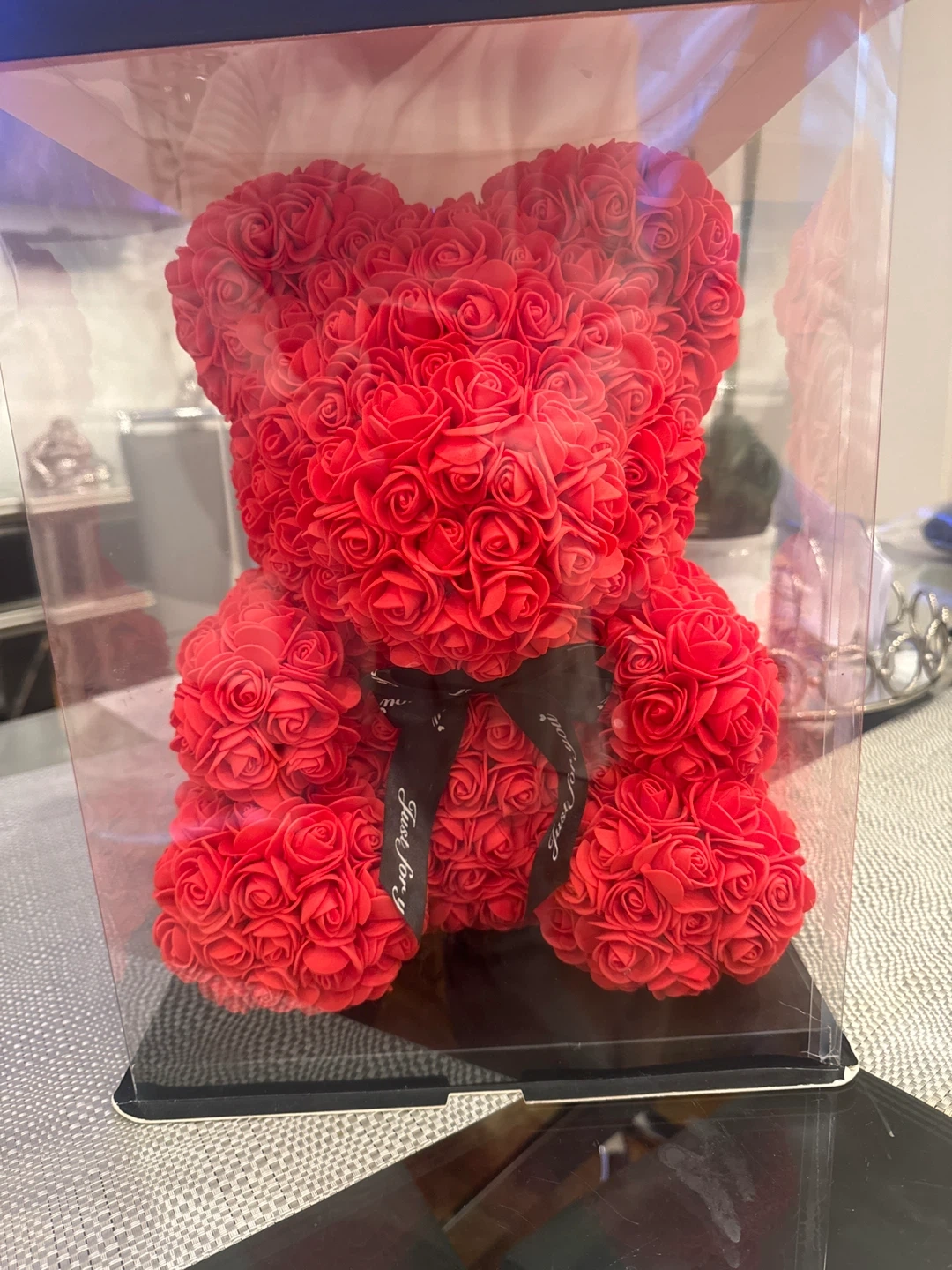 Selling a cute red teddy bear made of roses! It's encased in a clear box, making it a perfect gift or decorative piece for your home