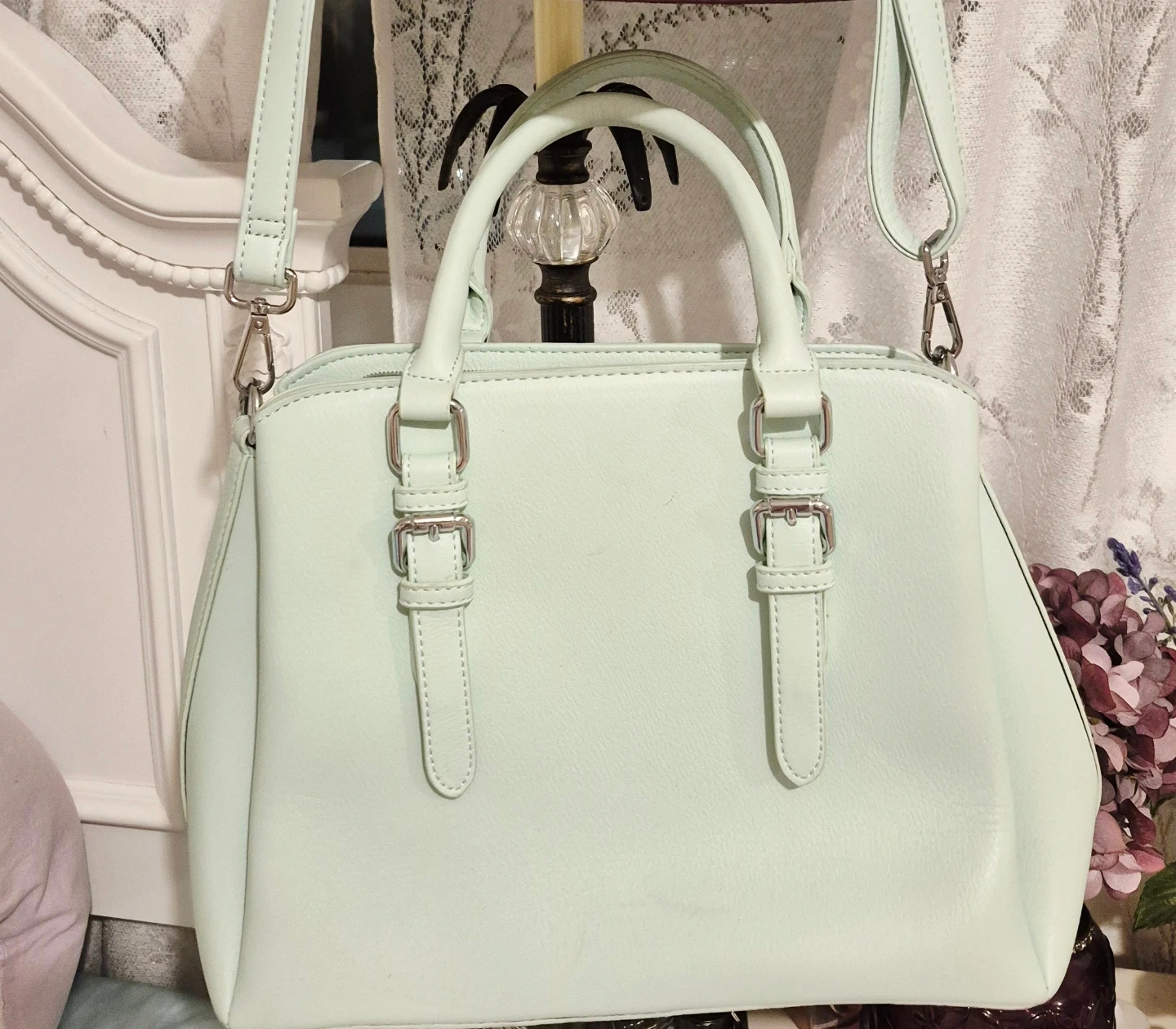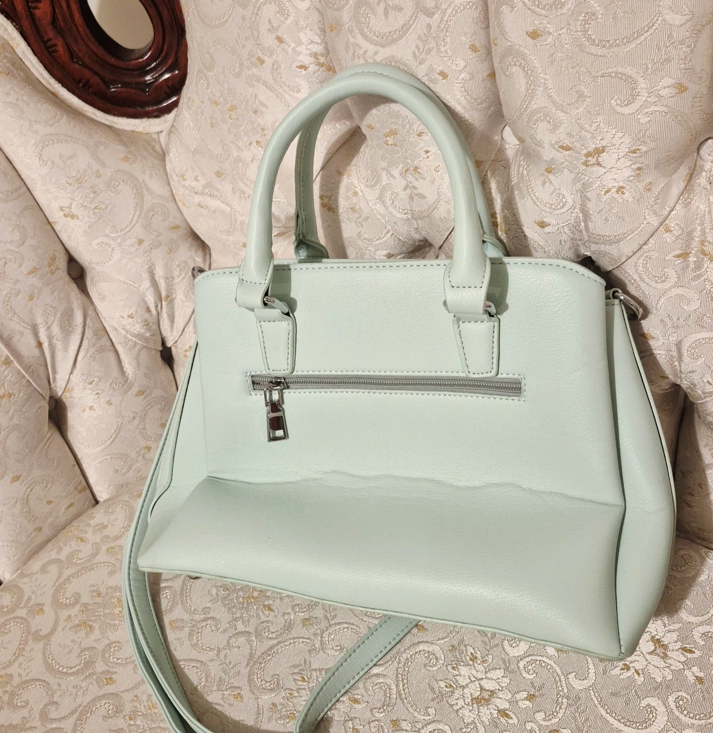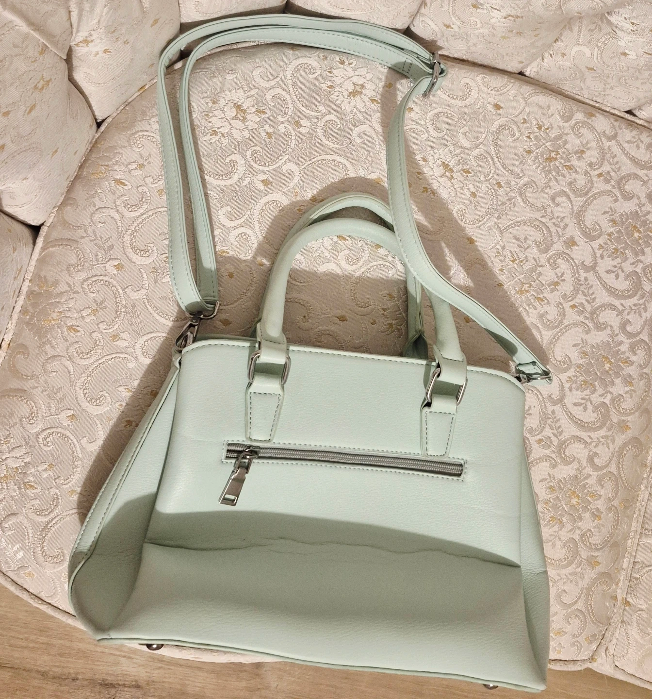 This satchel handbag is a lovely pale mint green colour. It has a floral patterned lining inside for a pretty touch. Includes a detachable shoulder strap for versatility.
