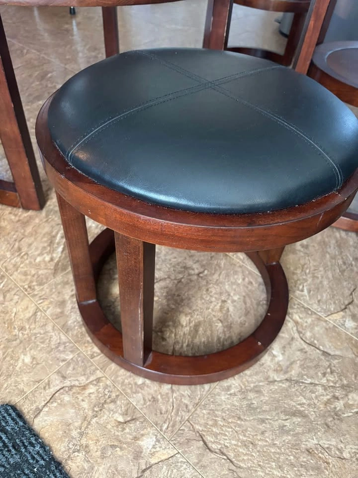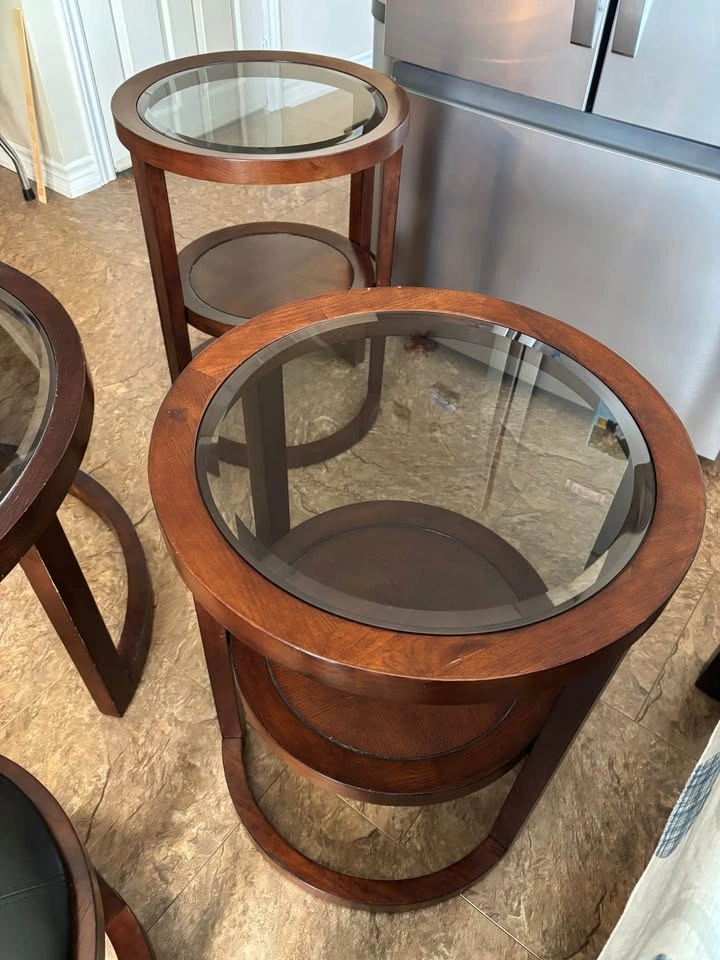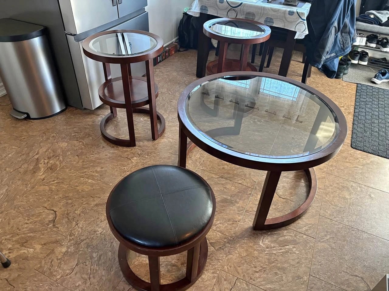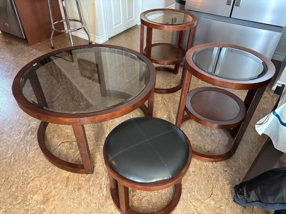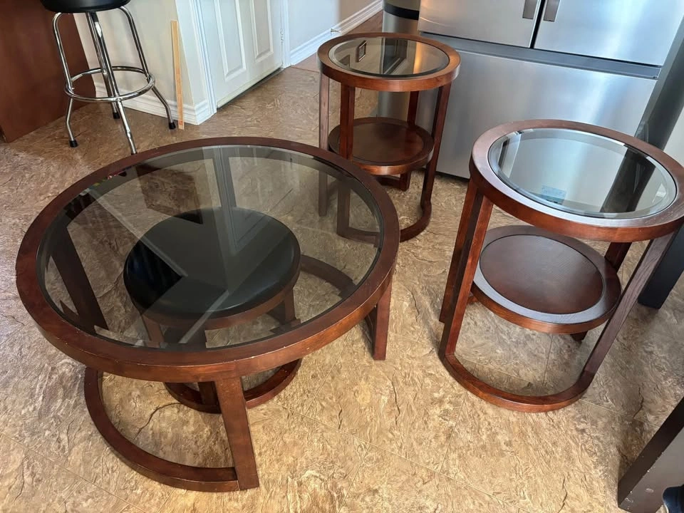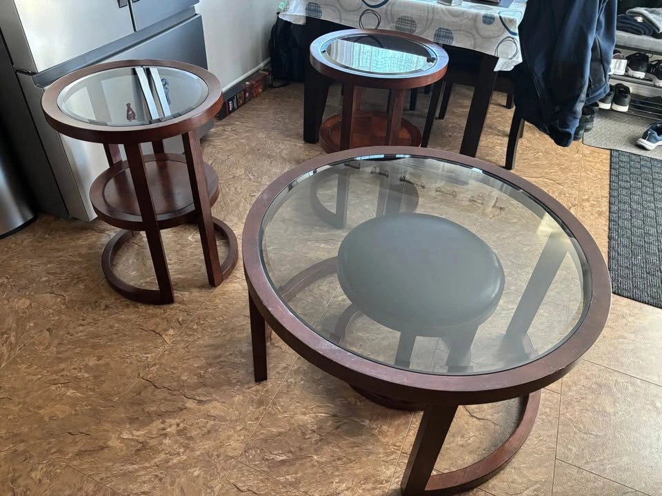 10Selling a custom circular living room coffee table with matching end tables and tucking foot stool with glass tops in very good condition. Measurements are : End tables 20” wide / 26 1/2 “ height Coffee table. 36” wide / 20” height Stool 18” wide / 17” height Selling as a complete set for $300 or best offer.( bought new $ 1,000 ) . Reason for selling, upgrading living room set.