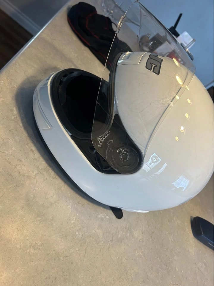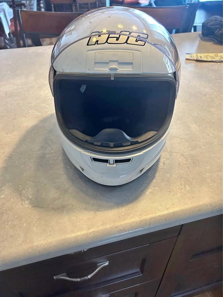10Full-face HJC CL-12 helmet in white—lightweight poly shell, clear HJ-05 visor (no scuffs), black interior used 3 times. No cracks, solid protection. Specs: • Size: Small (fits snug, check your measurements) • Condition: Good used—ready for casual rides or display