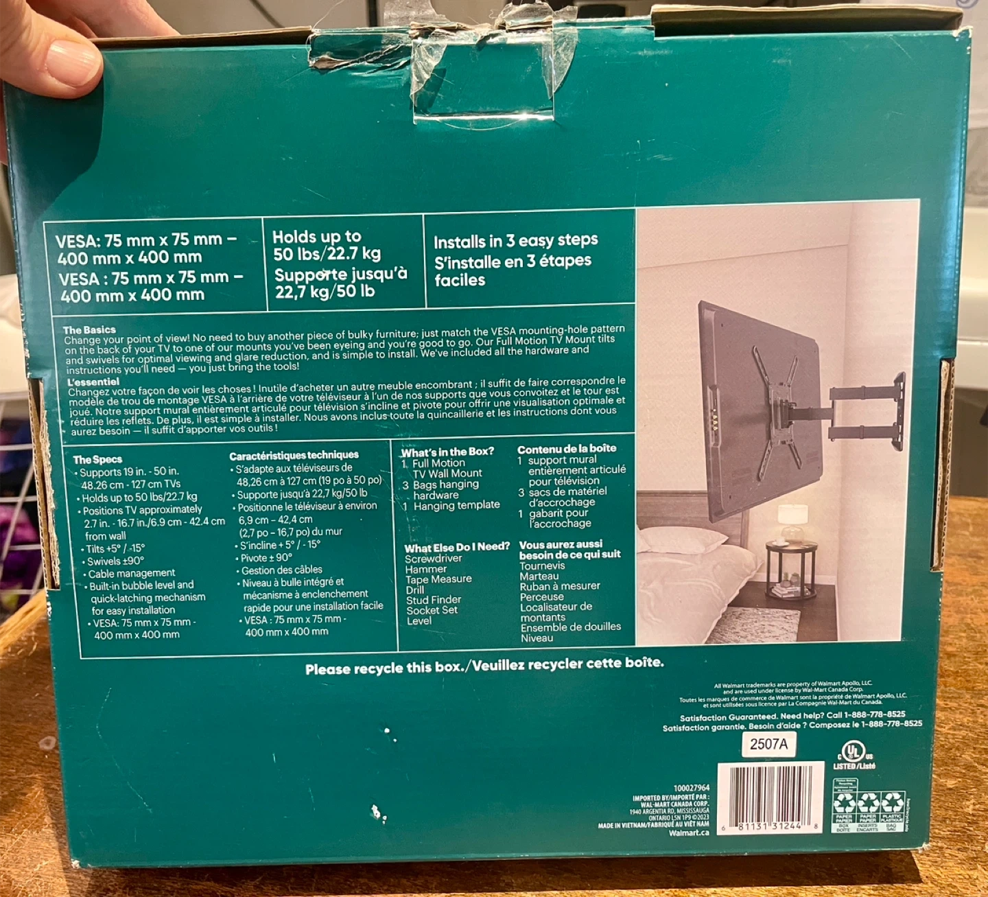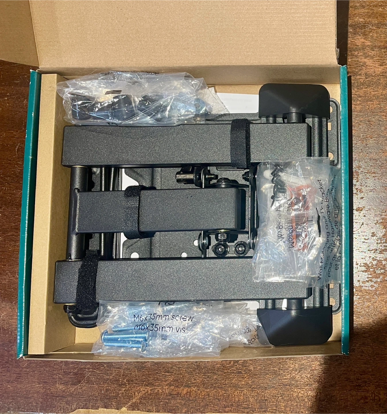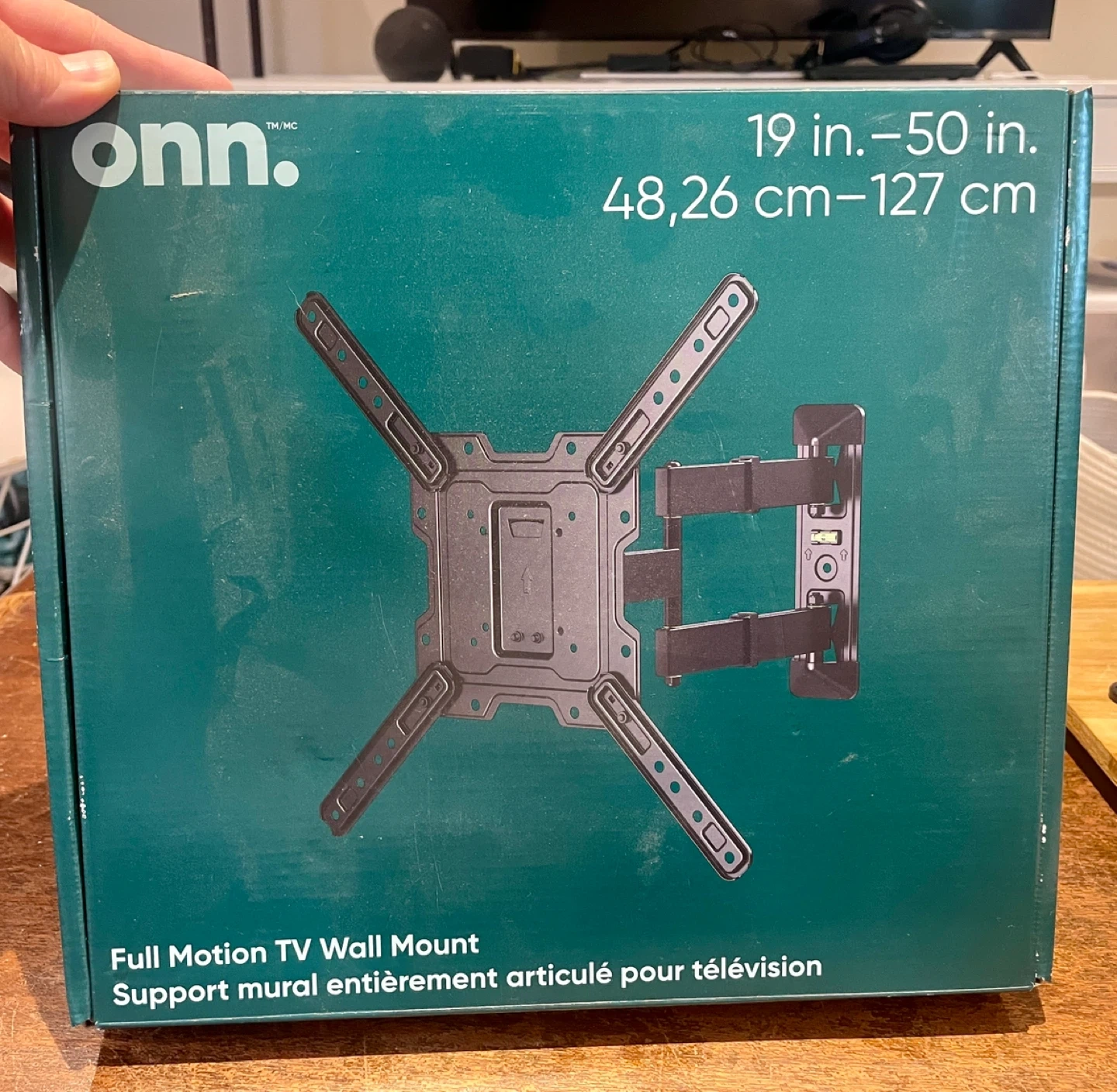170Selling an onn. full motion TV wall mount, suitable for TVs 19 to 50 inches (48.26 cm - 127 cm). It holds up to 50 lbs/22.7 kg and is VESA compatible (75 mm x 75 mm - 400 mm x 400 mm). It installs in 3 easy steps and comes with all the hardware and instructions in the box. Can schedule to meet up at Access Storage on Kelvin during storage business hours. Cleaning out storage unit so watch listings for more.