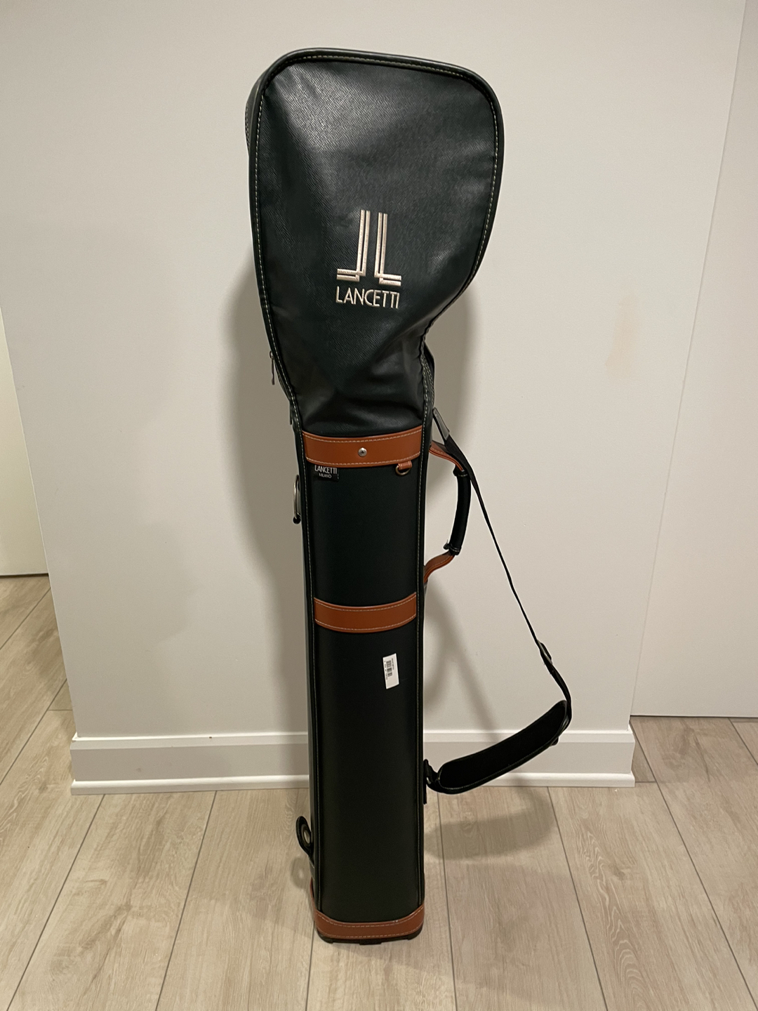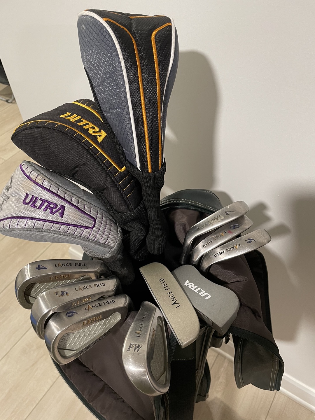 12Full set of golf clubs and bag. 4, 5, 6, 7, 8, 9, P Putters (x2) Wilson wood Wilson hybrid Langsfield hybrid Taylormade burner