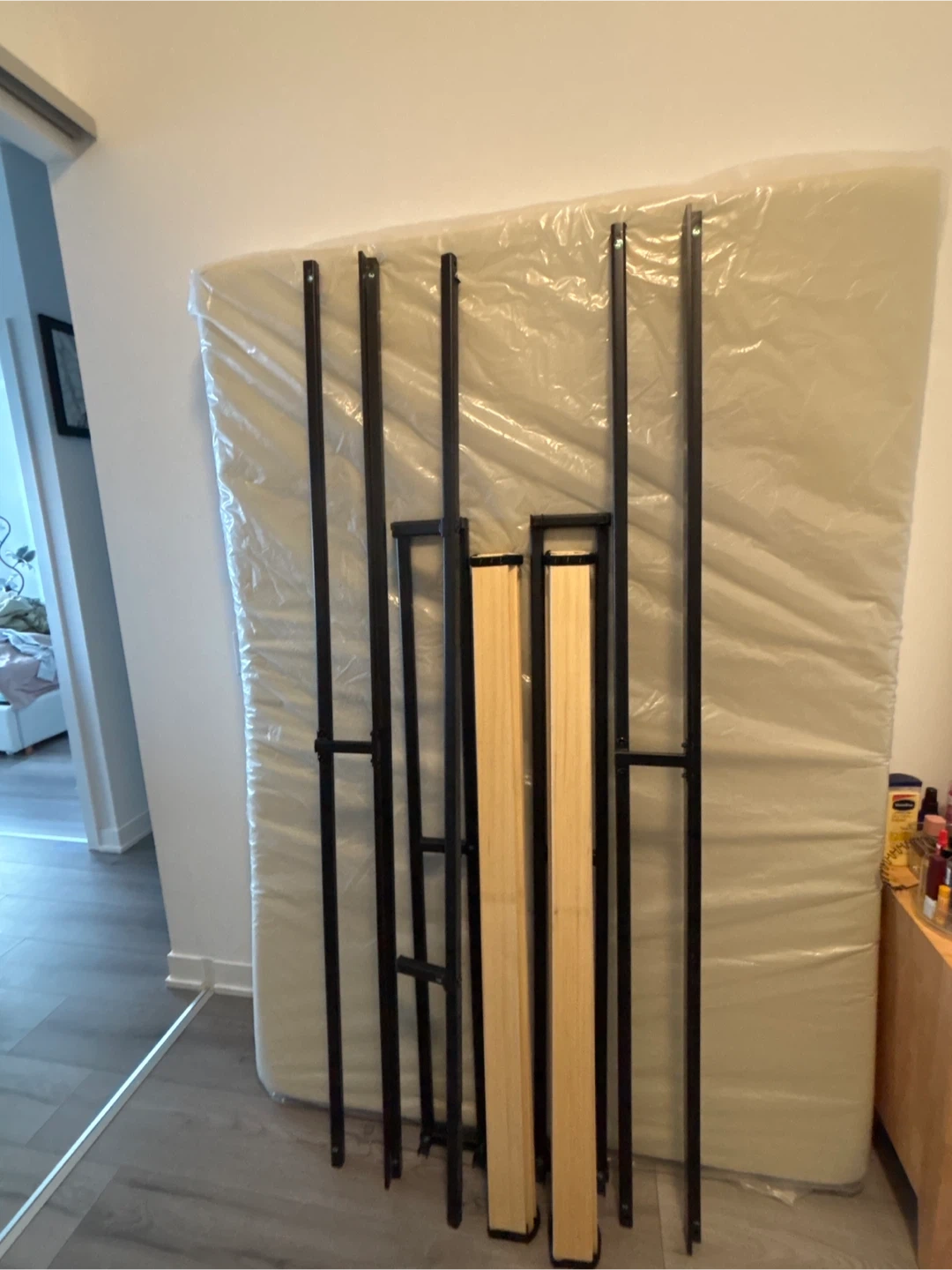 65Selling a double/ full size bed frame along with mattress . It's in great condition and ready for a new home! Moving sale. CASH ONLY. Pick up in Oakville. 1. Mattress has removable and washable cover. Mattress thickness= 14cm For Sale= $50 2. Black Bedframe can be disassembled for transportation . L= 191 cm B= 137 cm H= 15cm For sale = $80 3. Both mattress + bed frame=$120 The mattress has been packed and the bed-frame disassembled for transportation (as shown in the last pic)
