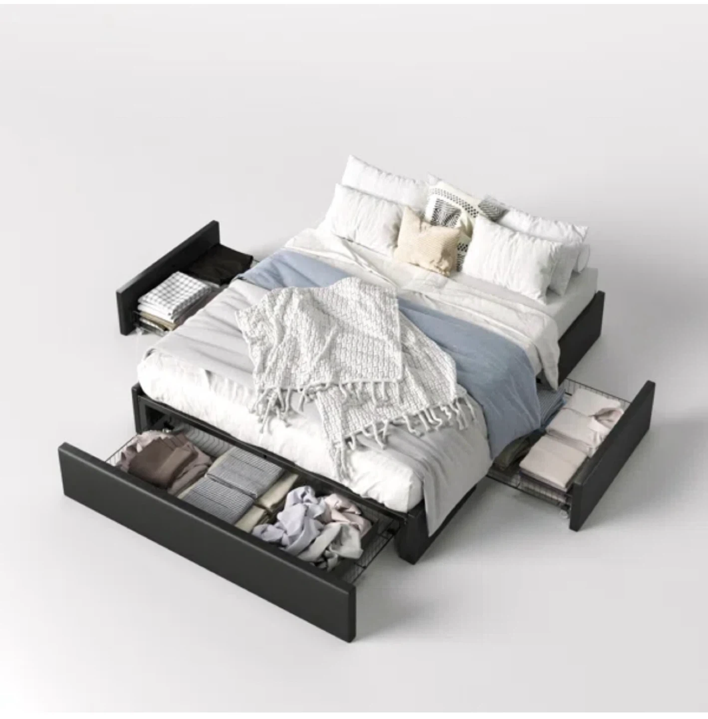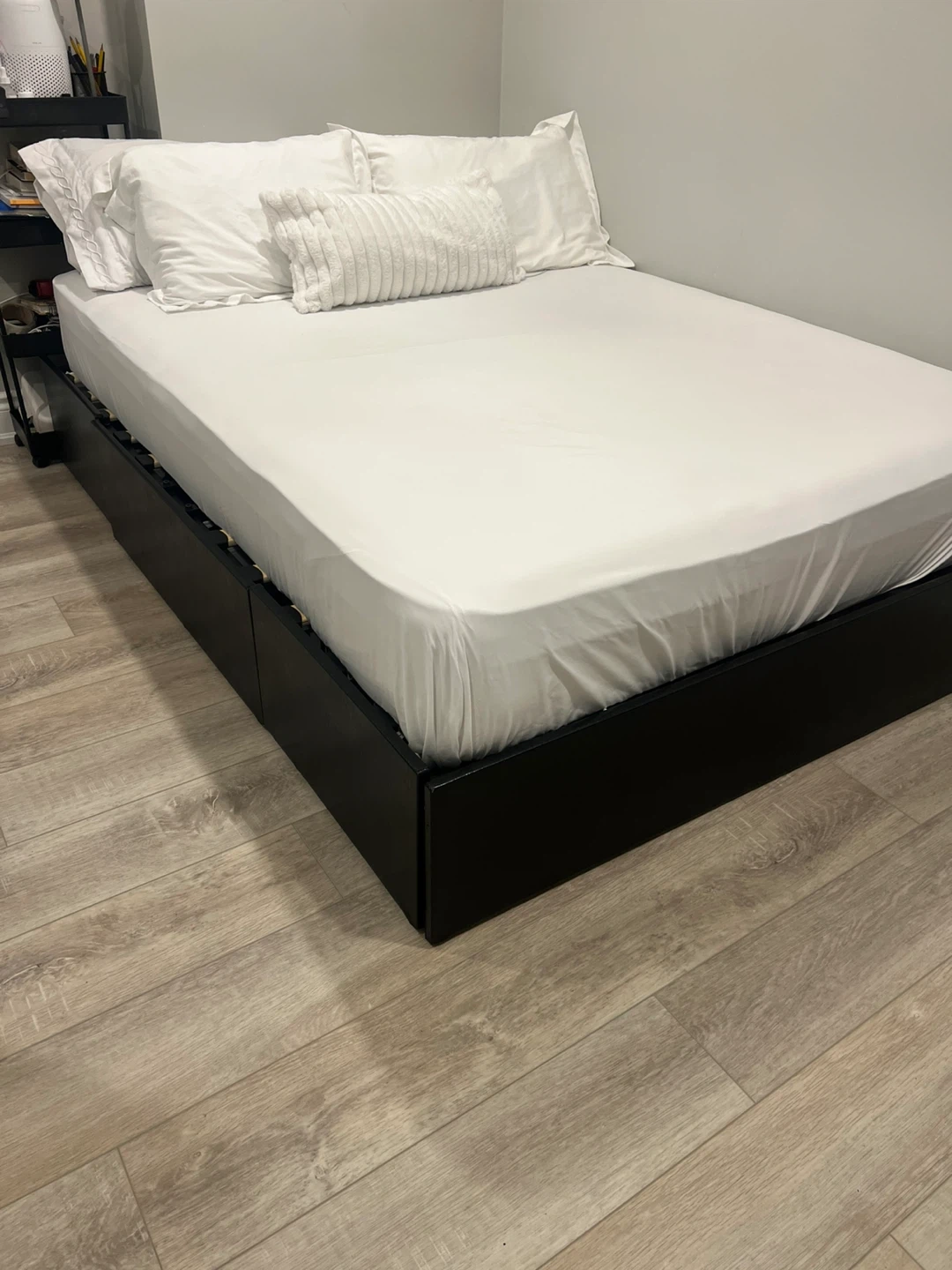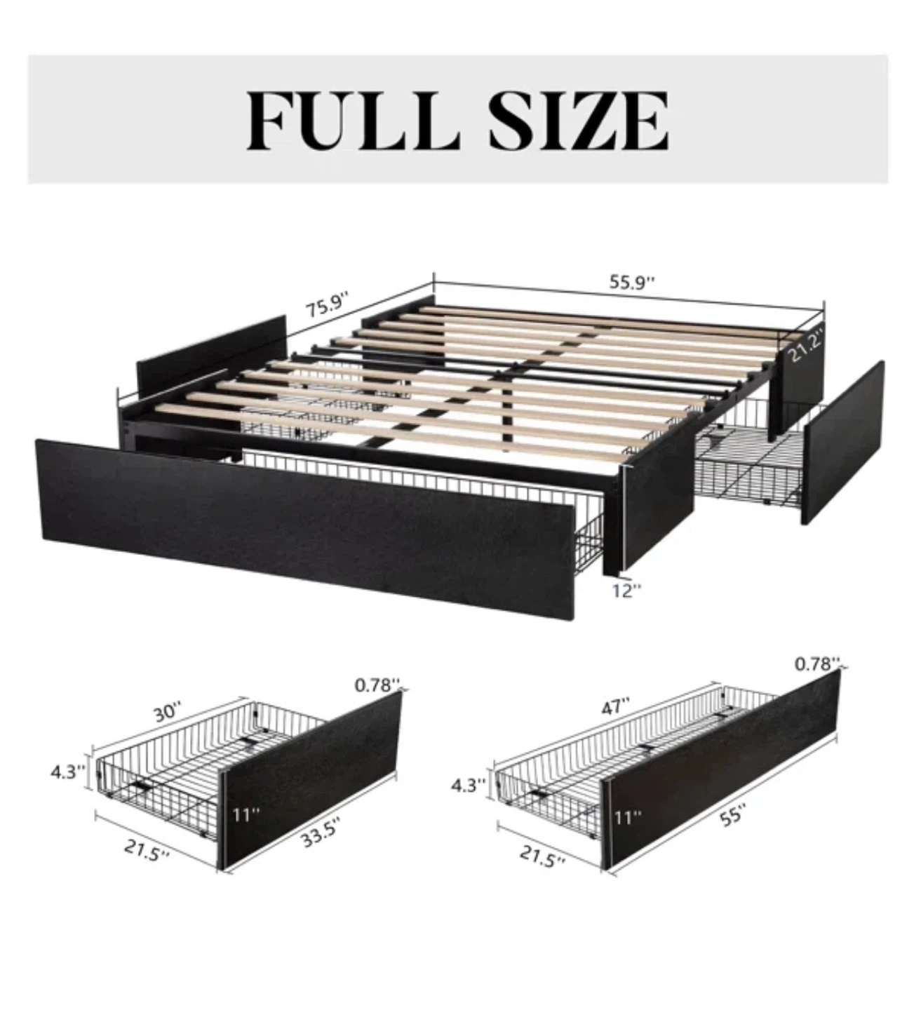 Selling a full-size bed frame in black! It comes with built-in storage drawers, perfect for maximizing space. The dimensions are approximately 75.9" x 55.9". Great for adding extra storage to your bedroom