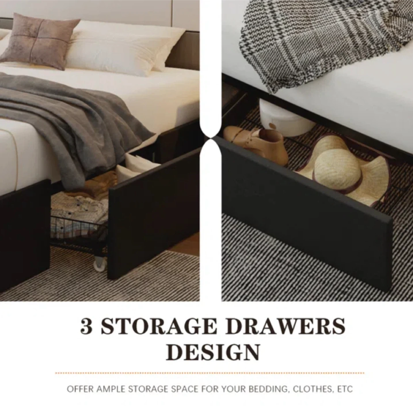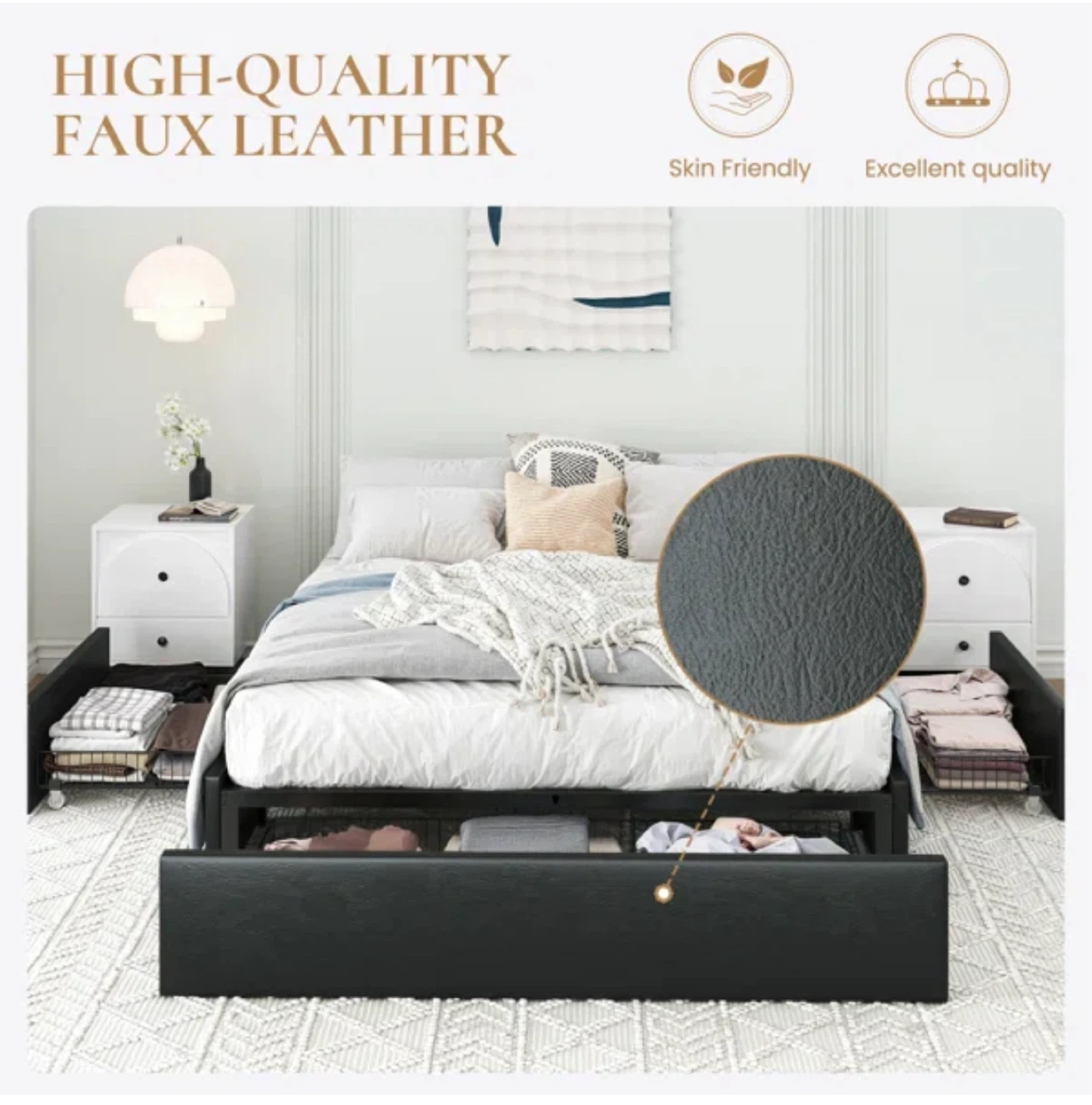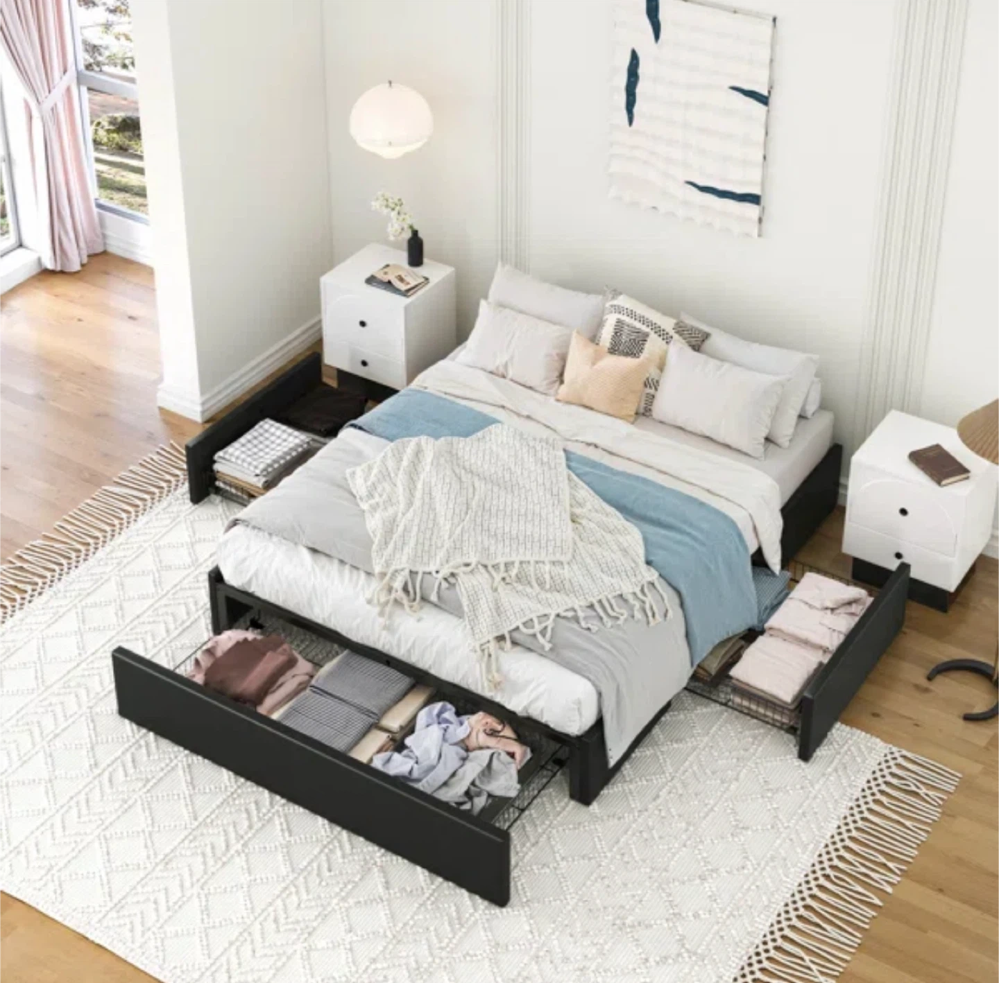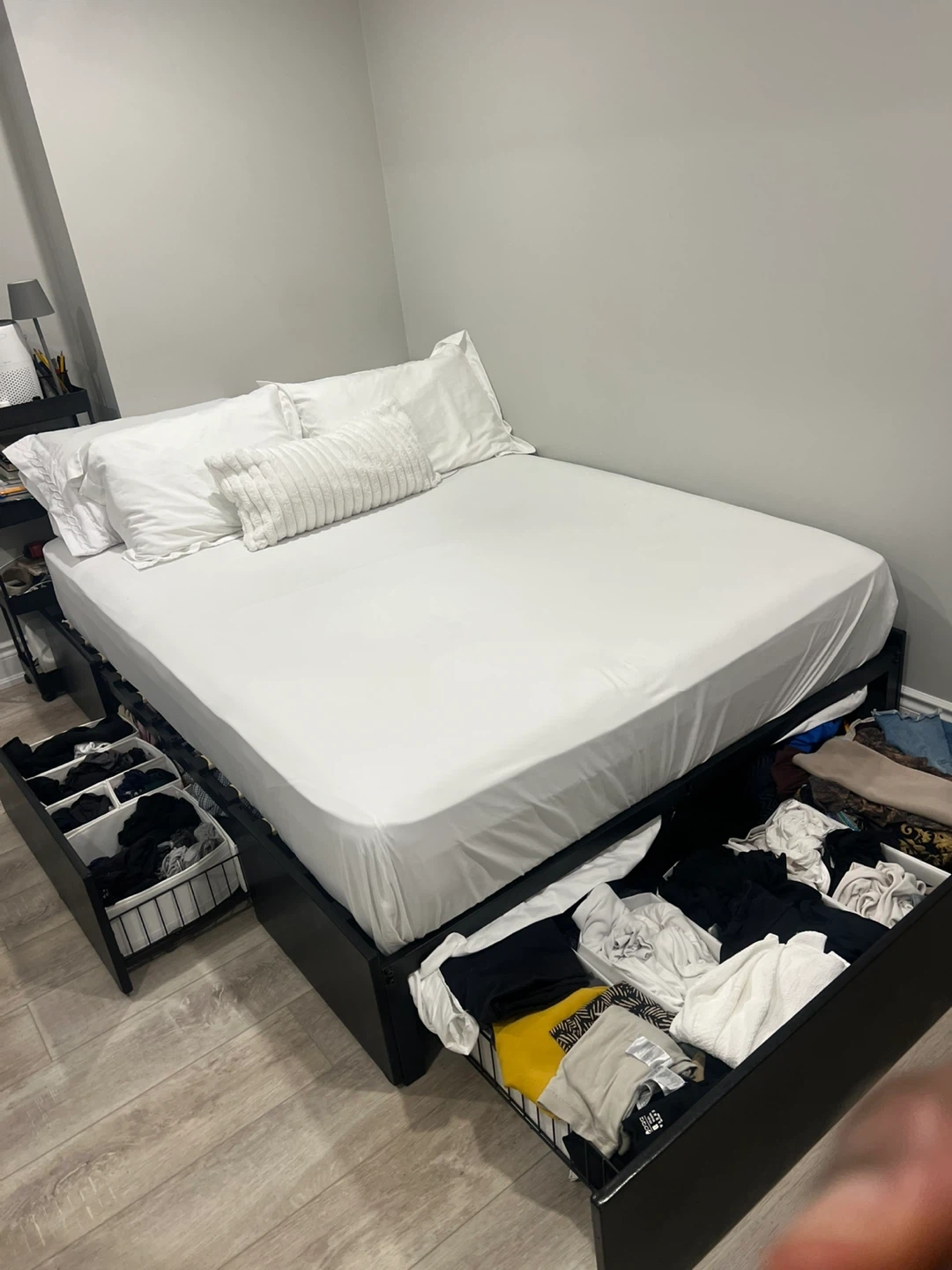 Selling a full-size bed frame in black! It comes with built-in storage drawers, perfect for maximizing space. The dimensions are approximately 75.9" x 55.9". Great for adding extra storage to your bedroom