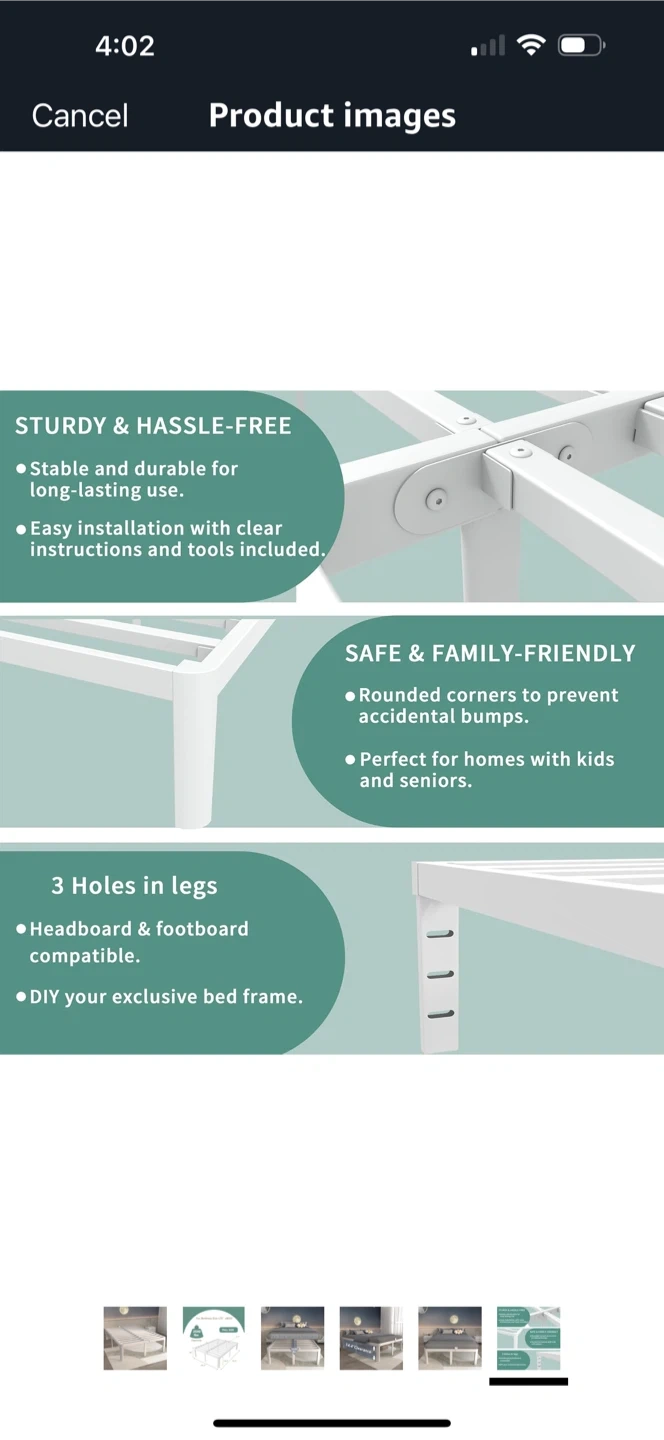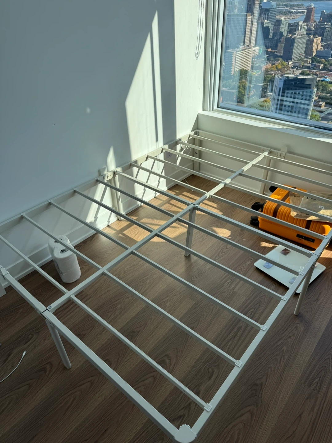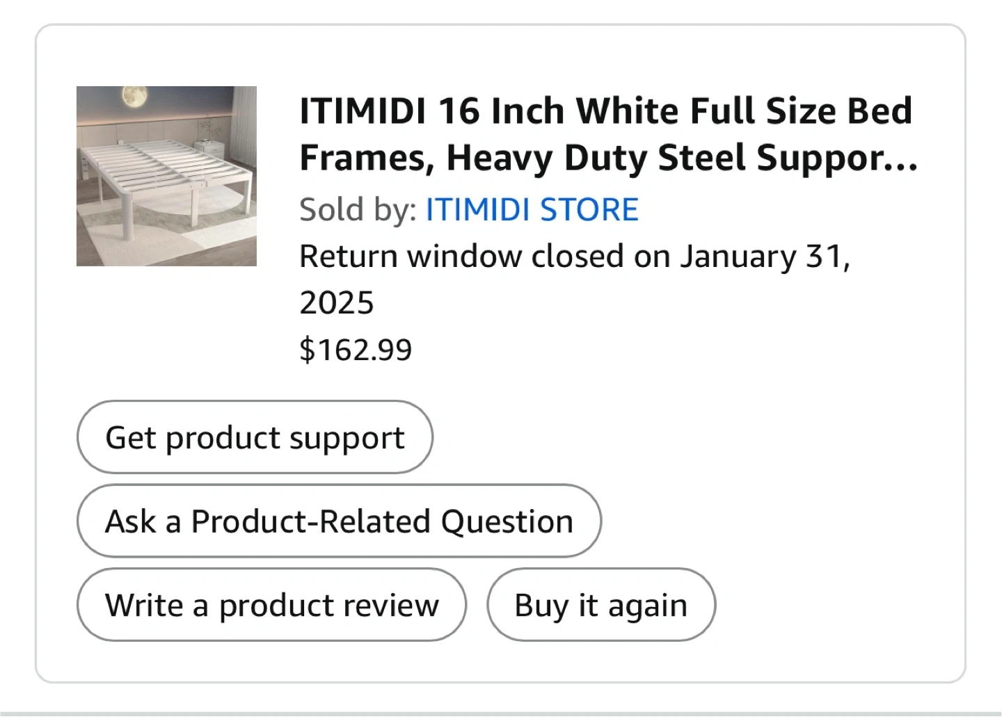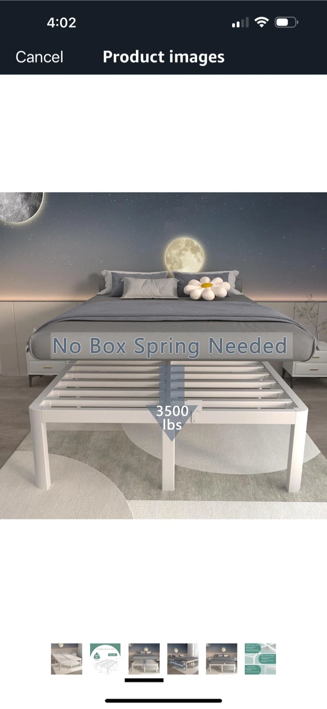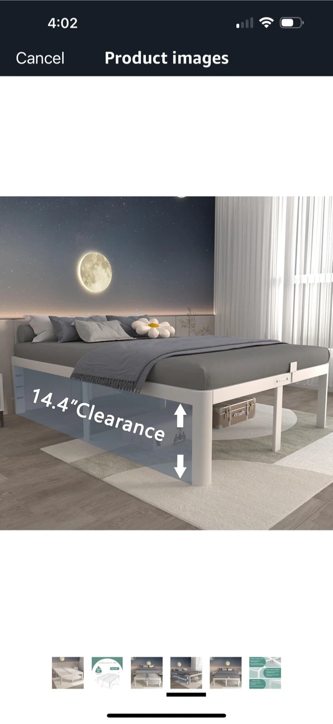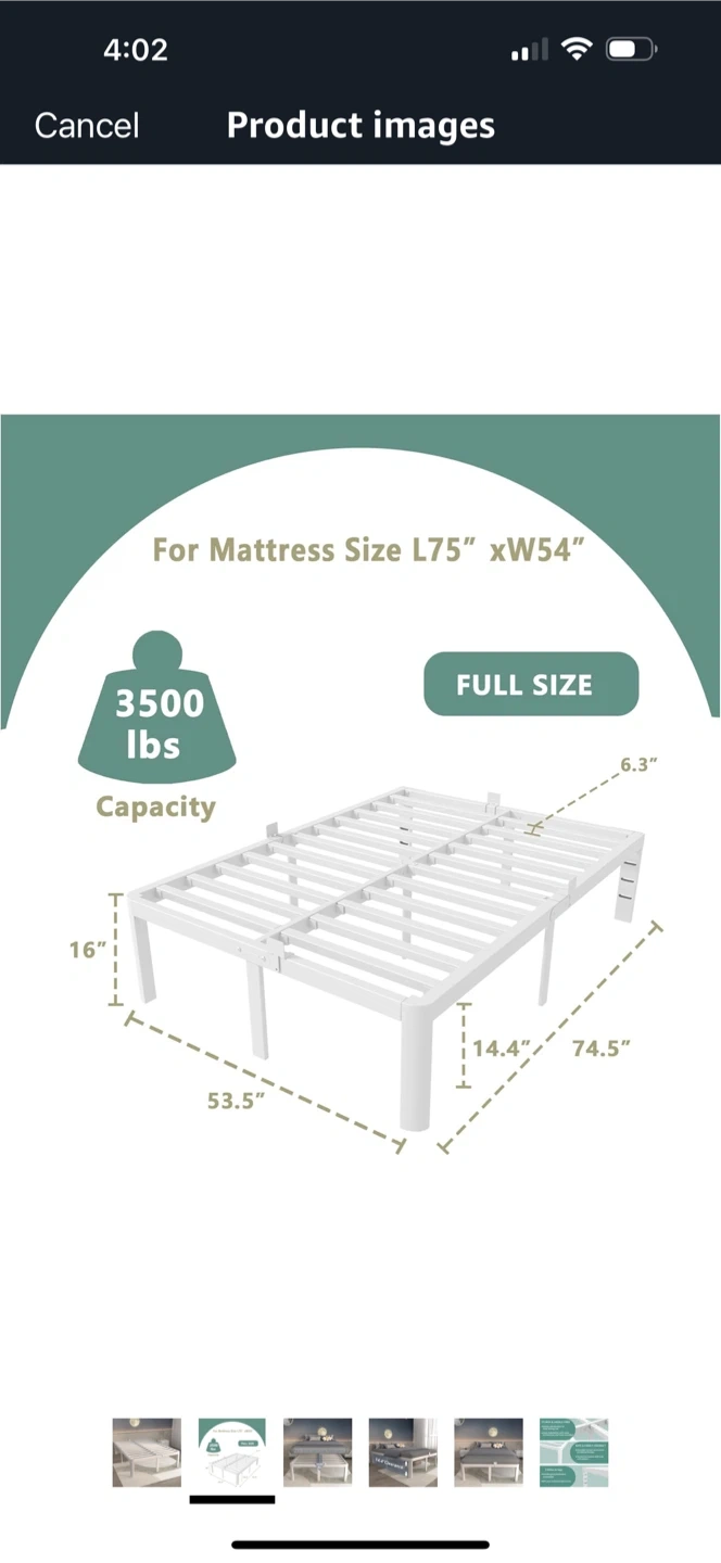 Selling a full-size metal bed frame! It's designed for a mattress size of L75" x W54". It has a capacity of 3500 lbs and provides 14.4" of clearance. No box spring needed.