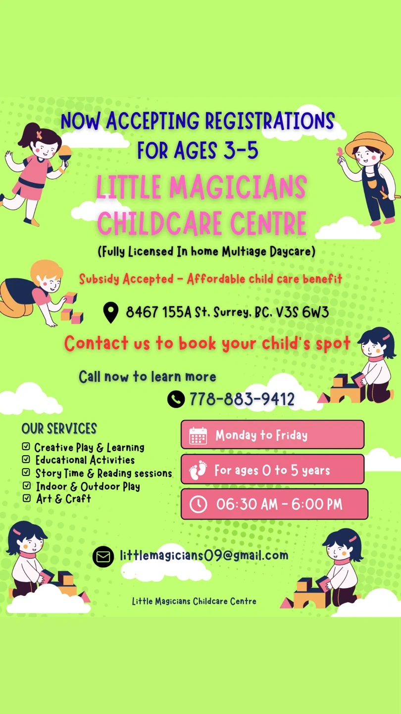20Day care spots available 3-5 near 155 street and 84 avenue. Monday to Friday 6:30 AM to 6:00 PM ACCB subsidy available CCFRI fee reduction program available