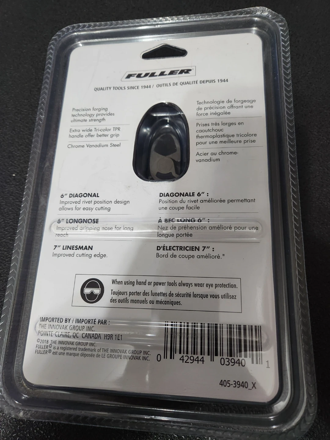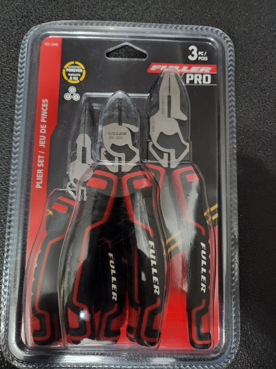 39Selling a brand new Fuller Pro plier set, still in its original packaging! This 3-piece set includes 6" diagonal, 6" long nose, and 7" linesman pliers. The pliers feature chrome vanadium steel and extra-wide Tri-color TPR handles for a better grip