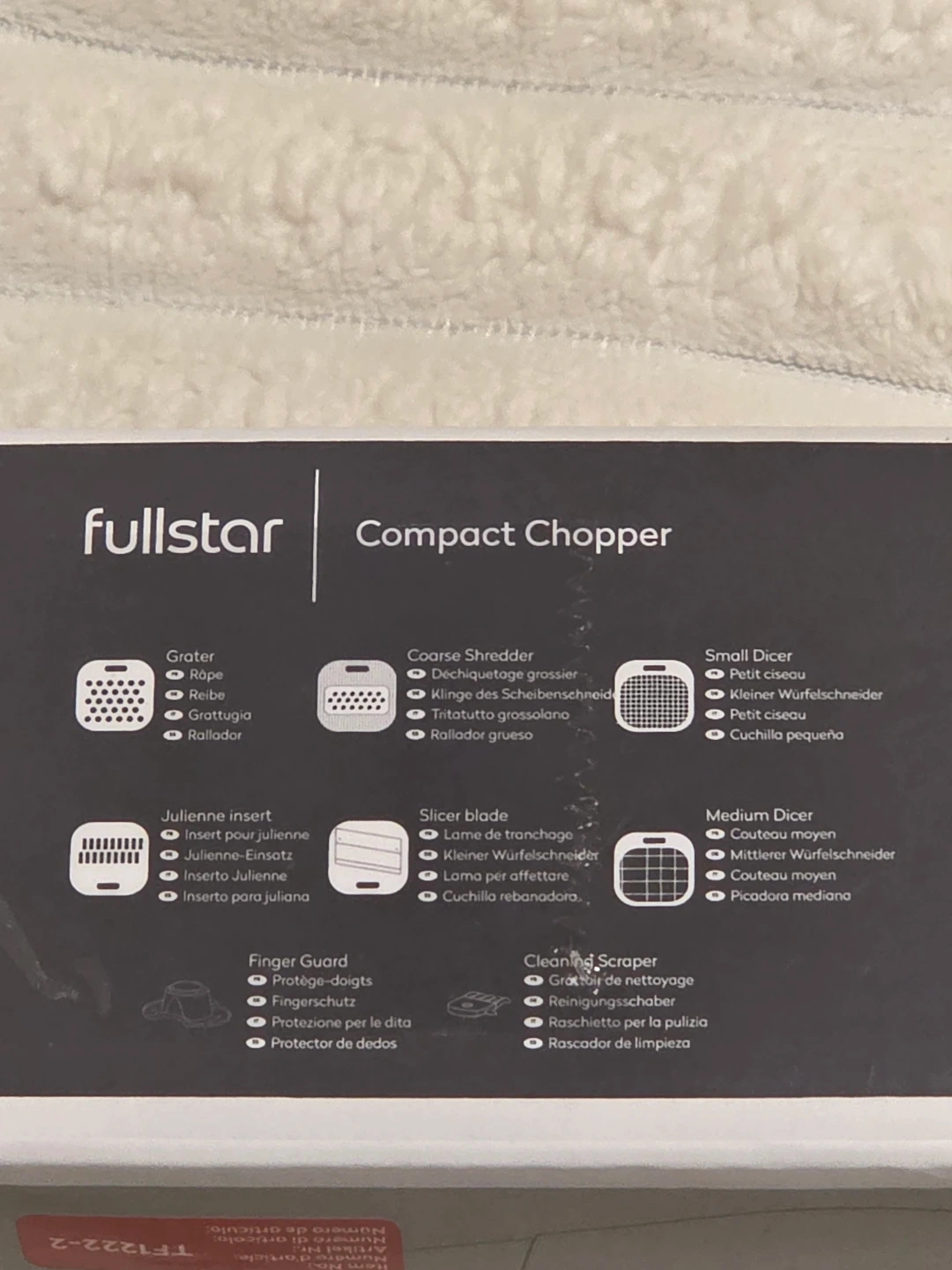 155I'm selling a Fullstar Compact Chopper! It comes with the box and all the attachments. This compact chopper is great for grating, shredding, dicing, and more. It has julienne and slicer inserts, a finger guard, and a cleaning scraper. It's available in black and white! •Original packaging •must meet in a public place •Cash only