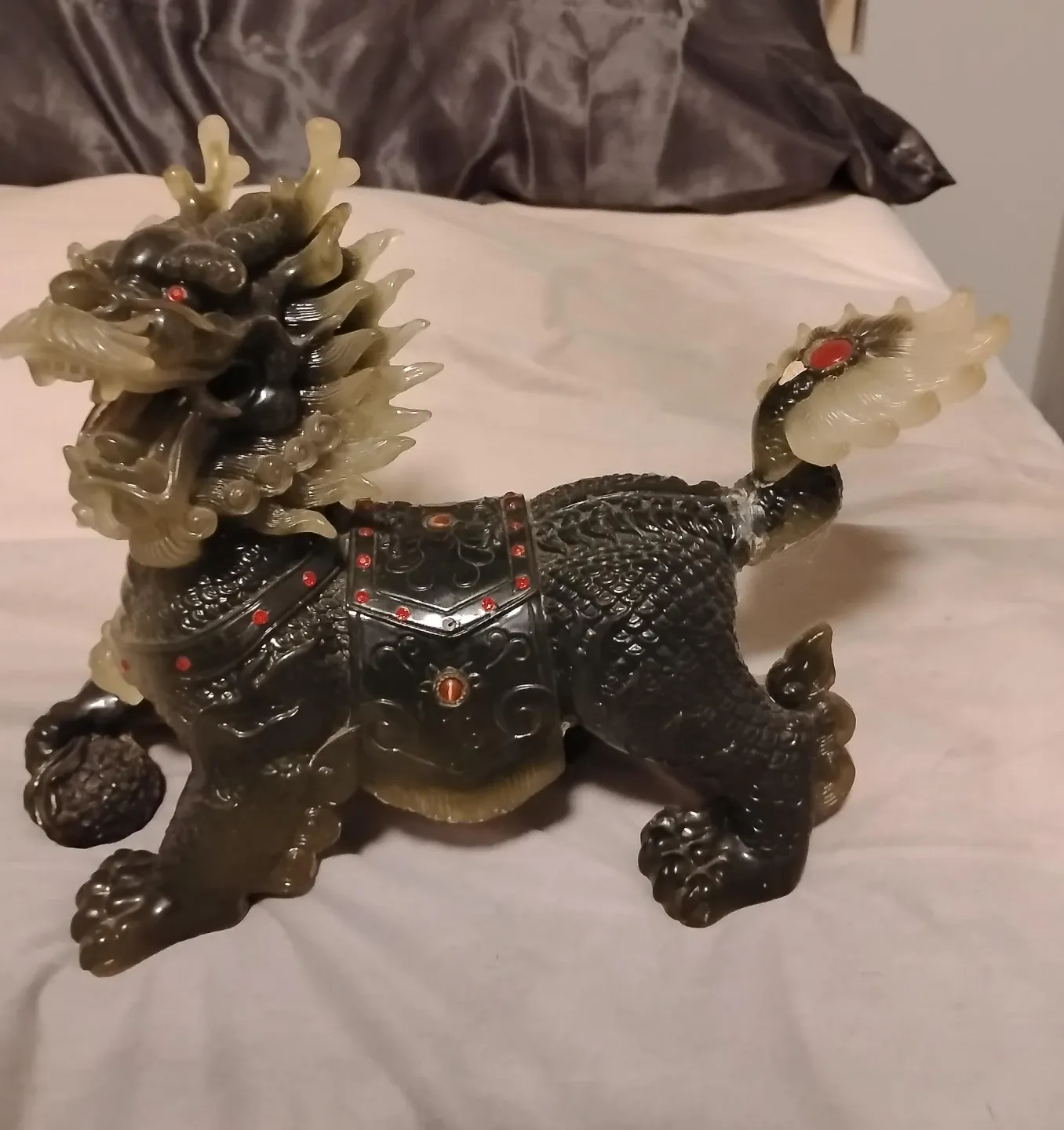 This detailed statue depicts a mythical Chinese dragon. It's made of a dark, translucent material with lighter, glowing accents on its mane and tail. Decorative red gems are set into its armour and eyes. This piece would make a striking display item for any home or office.