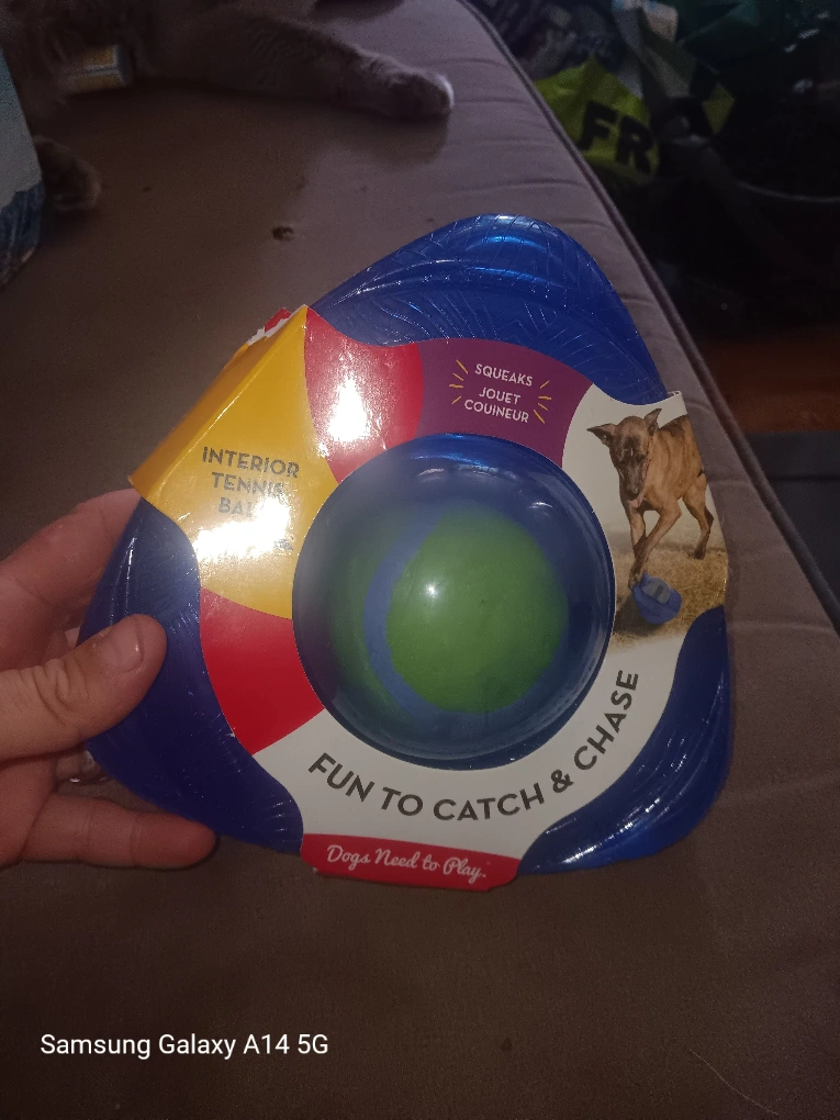 This is a fun toy for your dog to play with indoors! It features an interior tennis ball and is designed for fun to catch and chase games . It even squeaks!